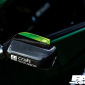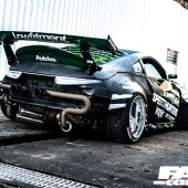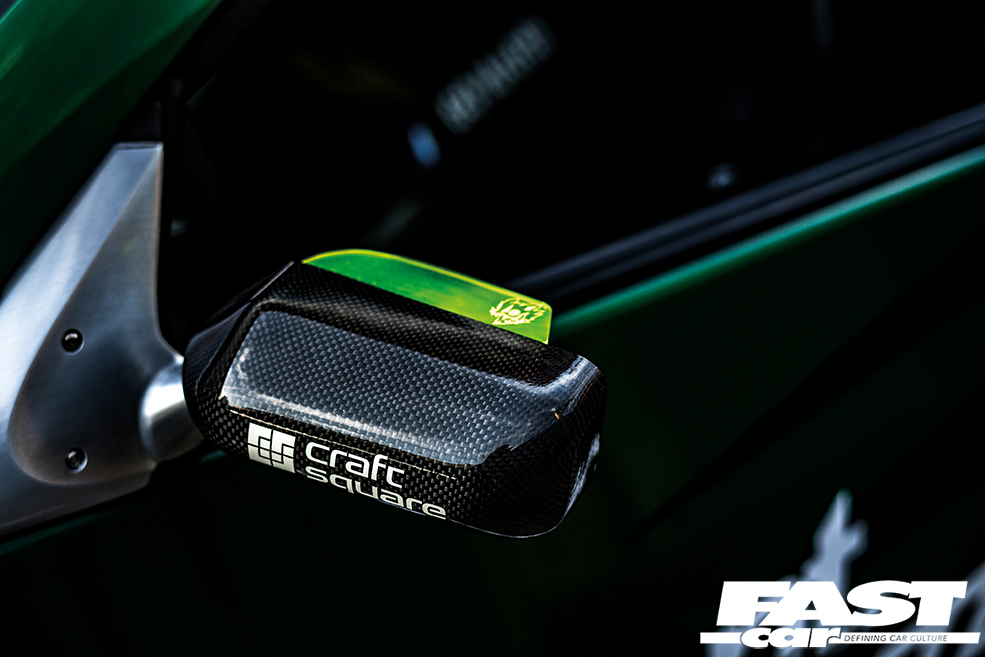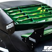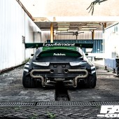 Fiberglass Mafia V2 rear wide arches, Fly1 Motorsports front arches, custom wrap by Blackfish Graphics, Big Country Labs rear wing, Craft Square mirrors, Raptor liner paint, custom Porsche-style rear with 911 taillights, Fly1 Motorsports ducktail, Lamborghini-style rear window louvres