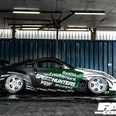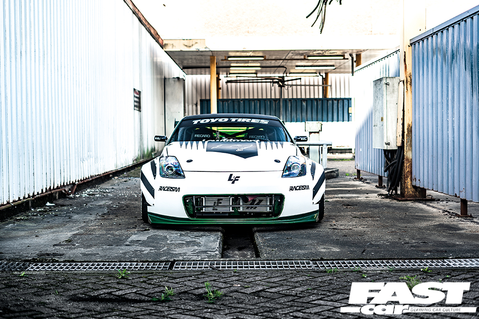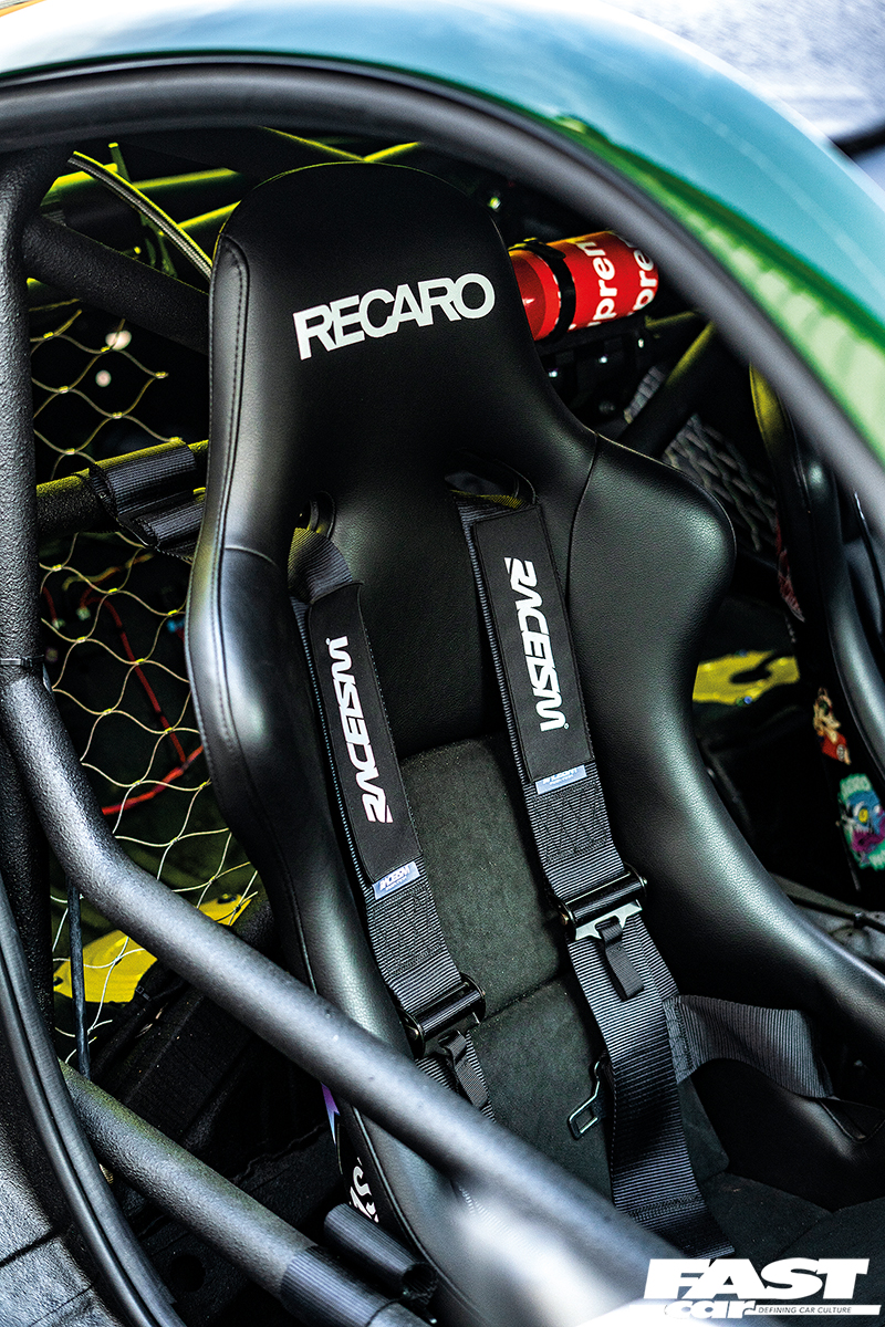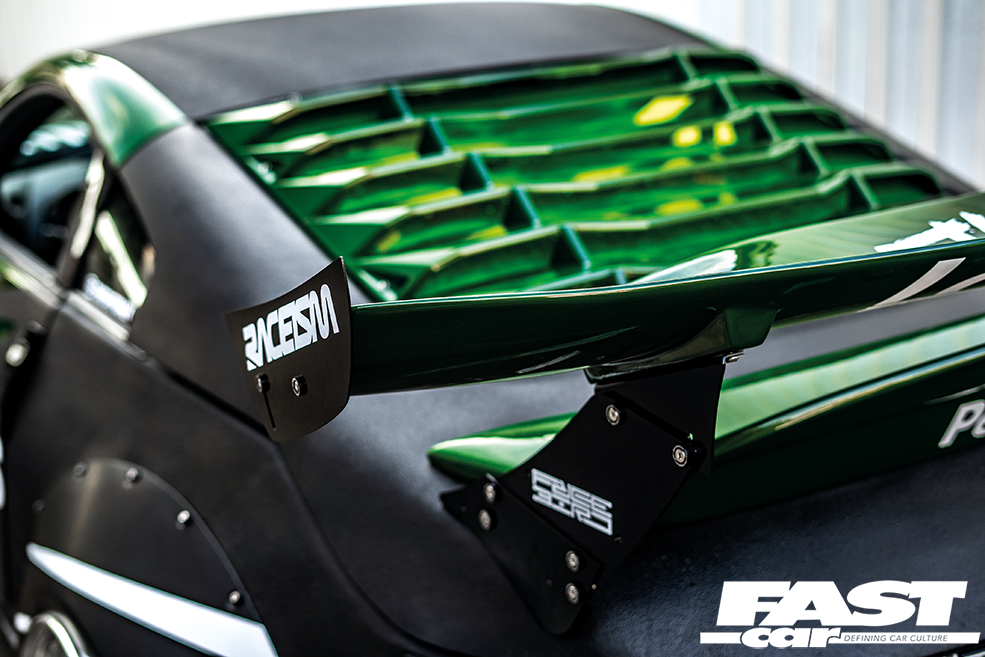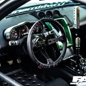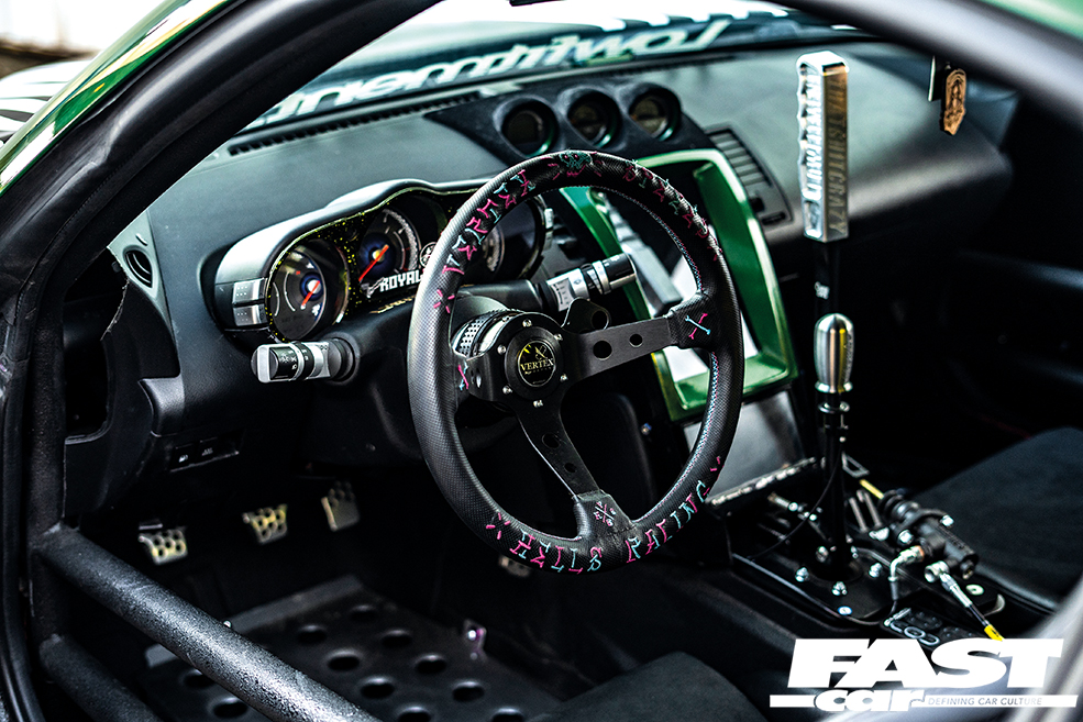 Those fat and imposing Fiberglass Mafia rear arches remain, but the fronts have been swapped out for Fly1 Motorsports items which extend further down the bumper. The rear wing has been replaced by a colossal Big Country Labs unit that sits at an aerodynamically sympathetic angle above the Fly1 Motorsports ducktail, and the body is wrapped in an aggressive drift-inspired wrap by Blackfish Graphics. But the true genius of the makeover is what Nick’s done to the rear end. There’s very little 350Z left in there, as he’s custom-mounted a set of 991-generation Porsche 911 taillights to neatly follow the angle of the bootlid. The bumper’s been thrown in the bin too, as the new custom exhaust features a pair of girthsome heat-wrapped pythons sinuously slithering their way hither and thither around the tail before exiting in the centre in a hellstorm of raucous barks. The cutaway tail reveals a clear plan view of the supercar-wide Toyo R888R rubber, which is now wrapped around a delectable quartet of staggered WORK Meister S1 wheels.