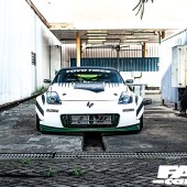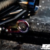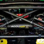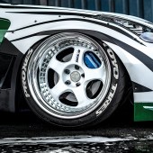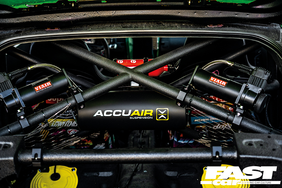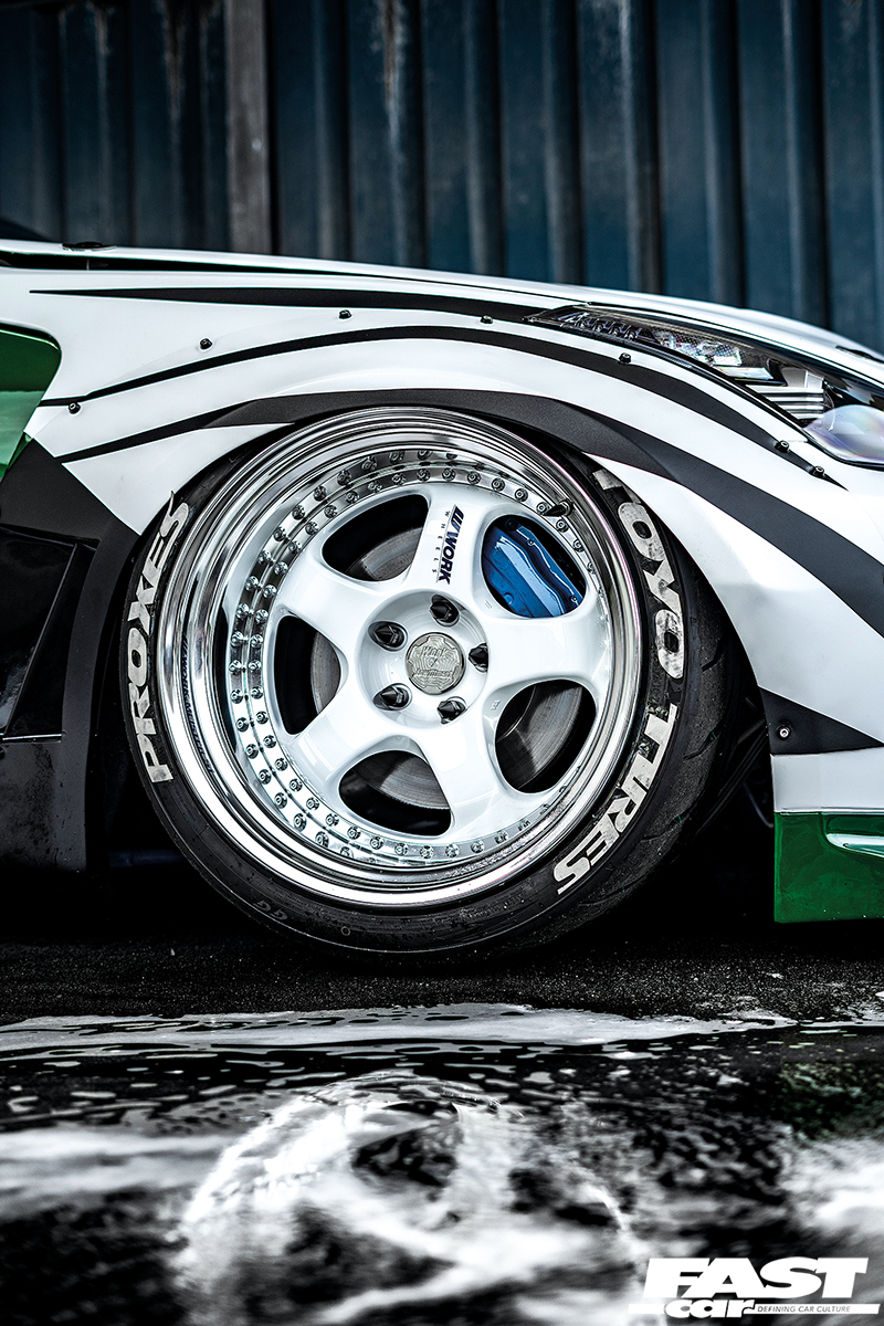 12.5x19in ET-14 (front) and 14x19in ET-9 (rear) WORK Meister S1 wheels, Toyo Proxes R888R tyres, Air Lift Performance struts with AccuAir management, Driftworks camber arms