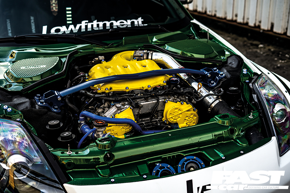 VQ35DE 3.5-litre V6, custom exhaust system, Chase Bays reservoirs, Mishimoto oil cooler, Mishimoto radiator