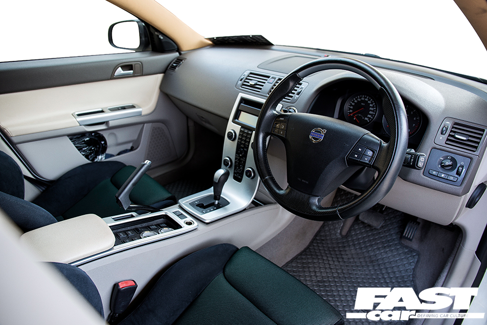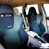 Naturally with great stance comes great responsibility, and the wide-body Volvo V50 needed those fat arches filled with something pretty tip-top. Smicha doesn’t disappoint here, drawing in the sumptuous treasures of WORK Wheels, specifically a staggered set of custom three-piece Meister S1s. It all kisses the tarmac with vivid enthusiasm thanks to a cunning air-ride setup courtesy of Hop-Up Airsus, taking some BC Racing BR Series coilovers and converting them to run bags. And the global reach of this concept reaches yet further as Japanese ingredients start to worm their way into the formula; the brakes are pure Mitsubishi – sitting on custom hubs we find the Brembos from an Evo VIII at the front and an Evo X at the rear – and inside the cabin resides a pair of Recaro CL7s sourced from a Honda Accord Type R. Richly diverse ingredients, but all fused in glorious harmony.