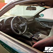 Those fat arches needed to be filled with something equally chunky, and AJ was ahead of the curve here: “I wanted a wheel that was widely unknown,” he says, “something that reminded you of others but was also clearly unique. What I’ve chosen is a set of Dinan Enduro three-piece wheels, custom-specced to 10.5×17” at the front and 12.5×17” at the rear. Only 50 sets of these wheels were ever made by DP Motorsport, a specialist Porsche tuning outfit, built for E34s equipped with Dinan turbos. My inspiration was to gain a Time Attack-inspired look for the streets; a way to make a statement whether standing still or in motion.” It’s fair to say he’s achieved this goal, and with that puzzle piece clicked into place, the overall outlook is pretty bright. Sitting in the driver’s seat, it’s the perfect fusion of retro-cool and modern modding. “I generally buy used parts and recondition them, and build the interior around the seat design,” AJ explains, and those Recaros make for a great centrepiece alongside the brutalist Cliqtuning chassis-mounted gear shifter and racer-chic deep-dish steering wheel. It’s in this up-and-at-’em position that AJ can enjoy his favourite element of the whole car. No, it’s not the wide-body arches, or the iconic colour, or the screaming S52. It’s that rare-as-hens’-teeth aluminium hardtop. “It gives the widebody E36 M3 an open and airy feel when driving without actually having the roof open,” he reasons. “It’s the most fun you can have in a car without the top down! And it also stiffens the chassis quite a bit…”