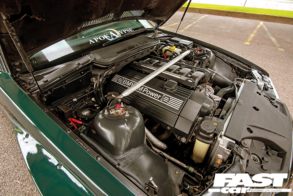 3.2-litre straight-six S52B32, ported and polished decked cylinder head, ARP head studs, Dinan intake with heat shield, M50 intake manifold, Dinan big-bore throttle body, Supersprint exhaust manifold, mid-pipe and axle-back stainless exhaust system, TRM custom dyno tune. ZF Type C five-speed manual gearbox, Clutch Masters Stage 3 clutch, 11lb flywheel, auto-spec LSD