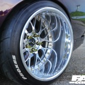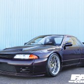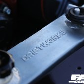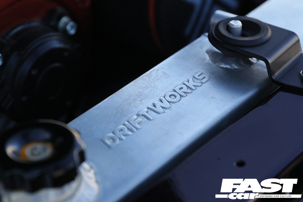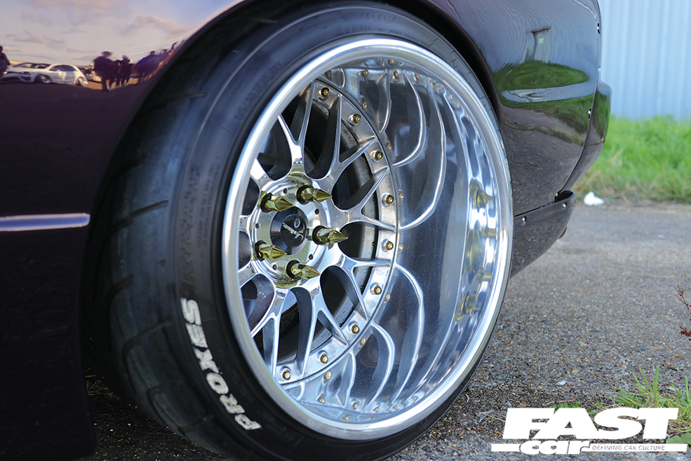 Custom 10×18-inch ET0 (front) and 14.5×18-inch ET-43 (rear) WEDS Kranze ERM 3-piece wheels, 265/35 (f) and 315/30 (r) Toyo Proxes R888R tyres, HSD coilovers with 12k (f) and 10k (r) springs, Chase Bays power steering reservoir and AN lines conversion, all suspension arms adjustable and bushed via Driftworks and Hardrace, polybushed throughout inc. subframes, steering rack and anti-roll bars, Driftworks front Geomaster knuckles, Hardrace HICAS delete (all lines and solenoids removed), Brembo Motorsport calipers, PBS Pads, 365mm Mercedes-Benz ML55 AMG discs, Chase Bays brake booster delete with braided lines and bias valve, calipers refinished in Milano Red, tubbed front inner arches, rear tubbed arches to allow for kit and wider wheels, chassis bracing from legs to subframe and subframe to tension braces, underside and inside arches bare-metalled and refinished