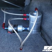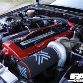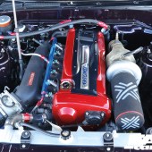 RB25 straight-six, 87mm Wiseco pistons, Manley rods, Nitto crank collar, rebuilt head with Supertech components, ACL race bearings, all ARP hardware, 6Boost exhaust manifold, GReddy intake manifold, custom hybrid Holset HX35 turbo, Turbosmart 45mm external wastegate with screamer underneath, Q45 90mm throttle body, Sard 1,000cc injectors, Sytec fuel pressure regulator, Link G4+ standalone ECU with switchable maps, RB26 rocker and timing covers modified to work with RB25, Tomei valley cover, large alloy radiator with electric fans and viscous fan, large front-mount intercooler and custom pipework, Torques swirl pot with Bosch 044 pump and 400lph in-tank pump, AN6 Teflon fuel lines from tank to engine, RB25 big-case Nissan gearbox, Cusco twin-plate clutch, custom 2-piece propshaft, Nismo 1-way diff, custom gearbox mount, Hardrace engine/gearbox mounts, part-smoothed and painted engine bay