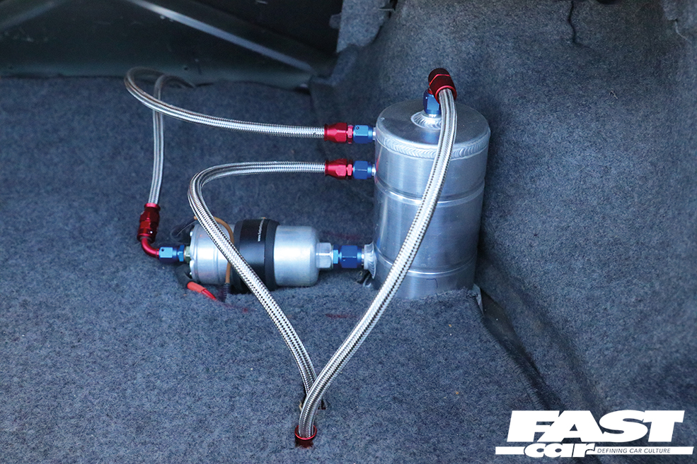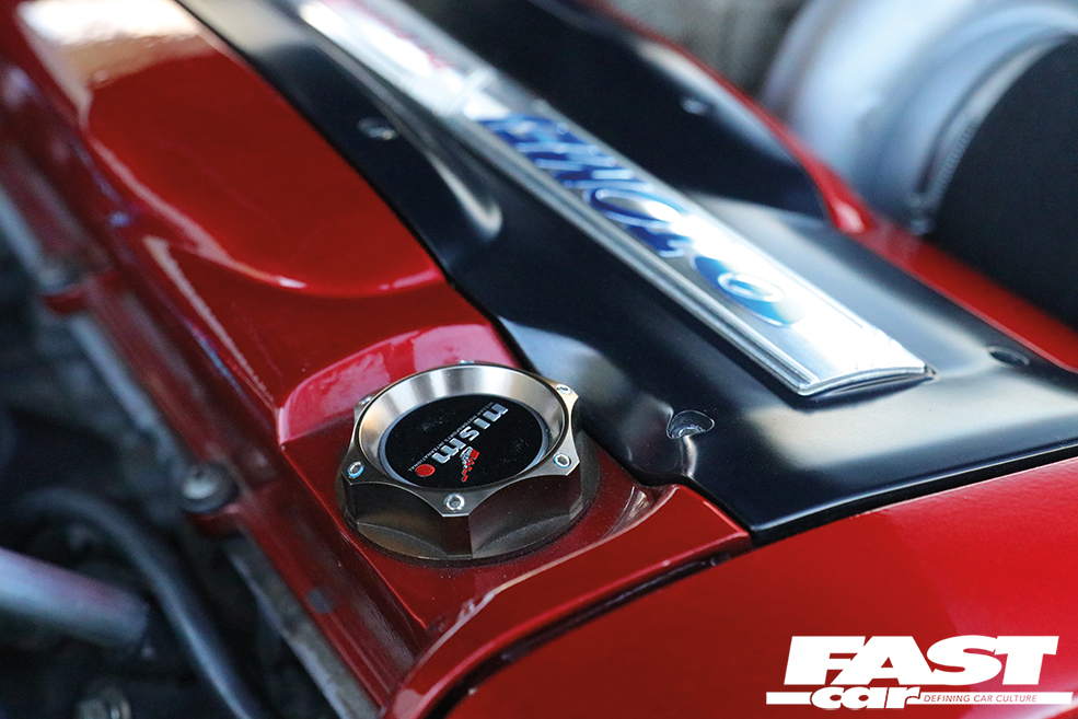 The engine spec today makes for pleasing reading, with the RB25 straight-six wearing a single custom-built Holset HX35 turbo along with a Turbosmart 45mm external wastegate and screamer. There’s a Q45 90mm throttle body and a smart fuelling system featuring Sard 1,000cc injectors and a boot-mounted swirl pot; the rebuilt head is stuffed with Supertech gear (and topped off with an RB26 cover for kicks) and the forged toys in the bottom end ensure impeccable strength. Managed by a high-end Link G4+ standalone ECU with switchable maps, it provides GT-R-shaming thrust and, of course, the drivetrain’s had to be bolstered to suit: an RB25 big-case Nissan gearbox joins a Cusco twin-plate clutch, with a custom two-piece propshaft running back to a Nismo diff. There’s absolutely zero cocking about here, this is all deadly serious stuff.