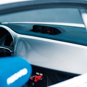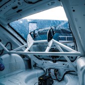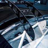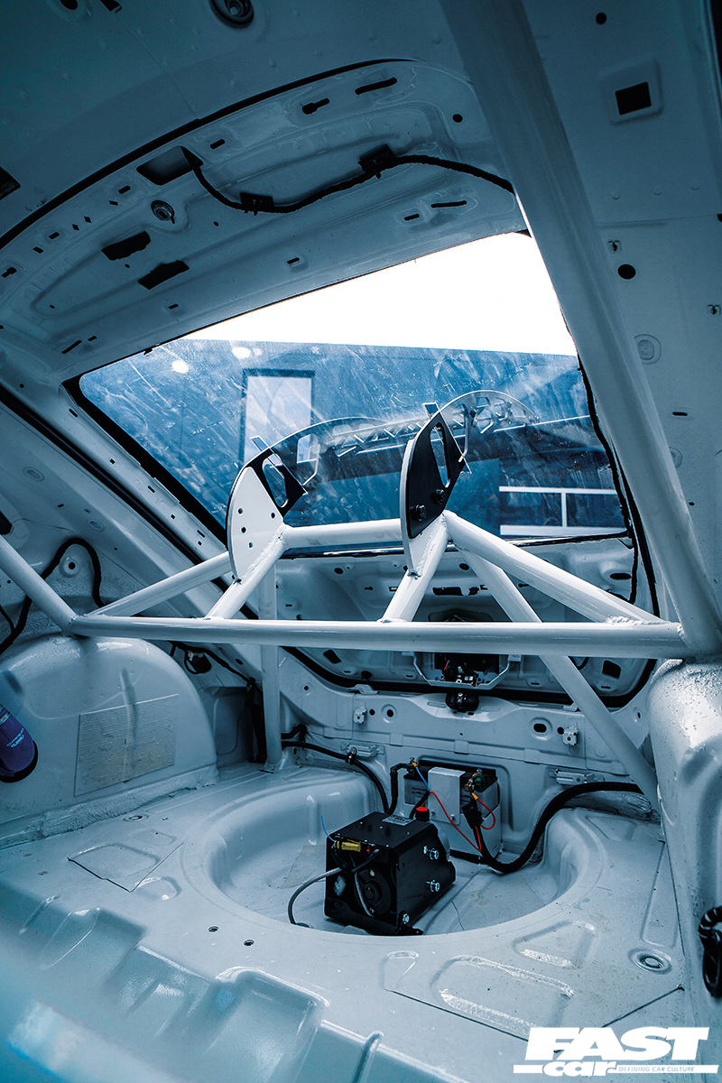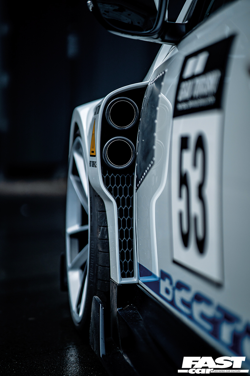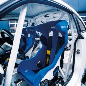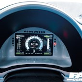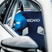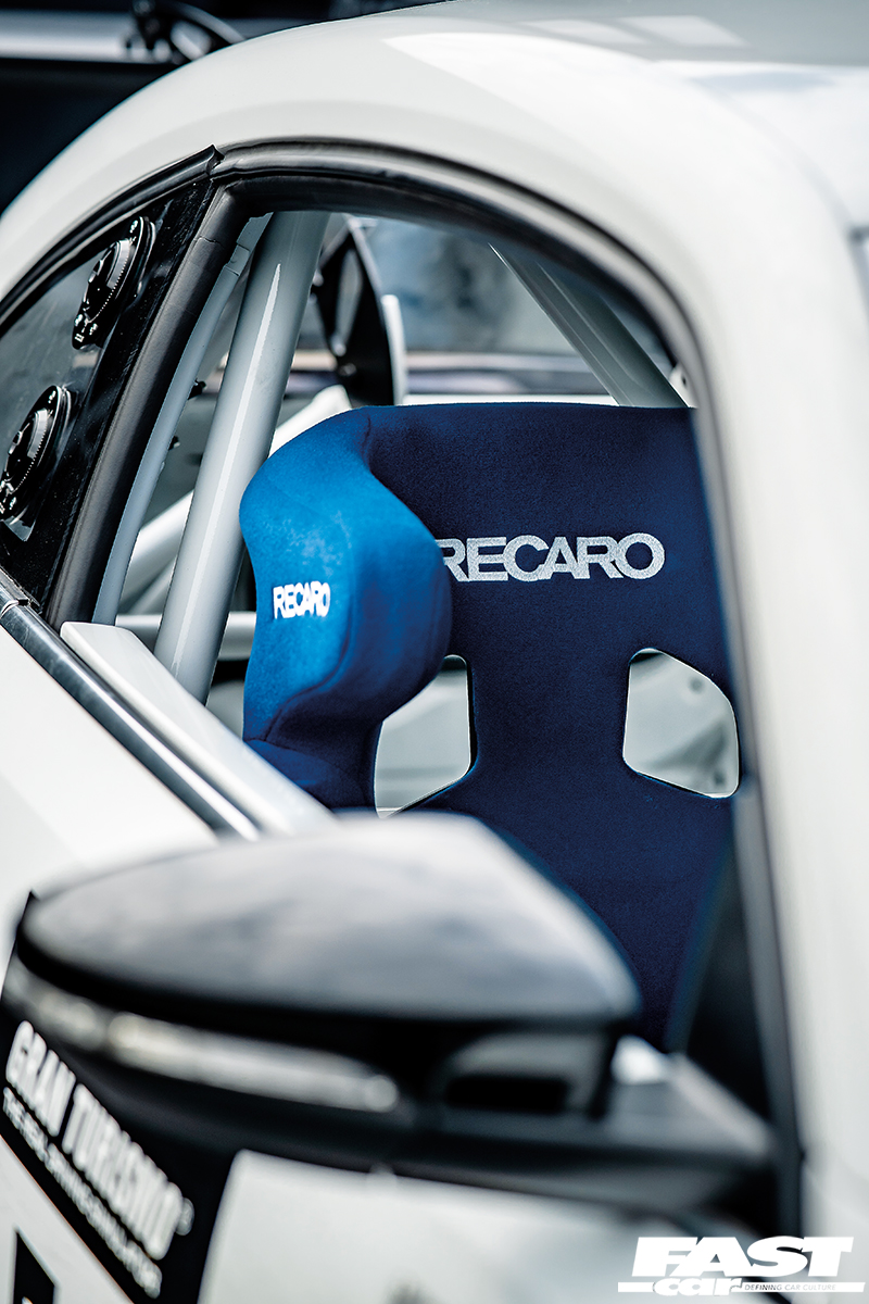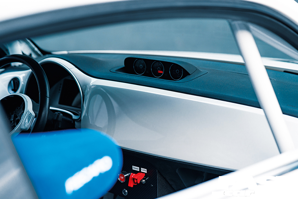 The interior of the car continues the white and blue theme with a body-coloured roll cage and blue Recaro Pro Racer seats grabbing the limelight. Other motorsport details like the battery relocation to the spare wheel well and Schroth harnesses look right at home. A custom plinth, again in white, dominates the dashboard and gives a minimal clinical appearance. A binnacle surround has been made in the same finish which houses a digital racing display. A pod of auxiliary gauges sits on top of the dash to monitor those all-important ‘Ts and Ps’. Carbon fibre door cards with blue pulls bring the whole package together nicely.