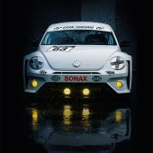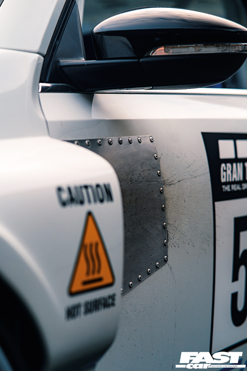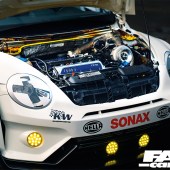 The widebody VW Beetle has been sprayed VW Motorsport white as per the game. VW Motorsport blue has also been used on the engine badge backgrounds and the impressive MOVIT Forged callipers from the six-pot big brake kit. Herbie 53 racing numbers are another feature of the game and a cheeky nod to the air-cooled star of the Disney film franchise and the heritage of the model. Metal heat shields on the doors do their best to prevent heat scorch. The racing sponsor graphics take their steer predominantly from the game as do the yellow LED foglights that poke menacingly out of the front valance.