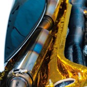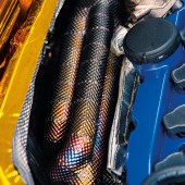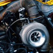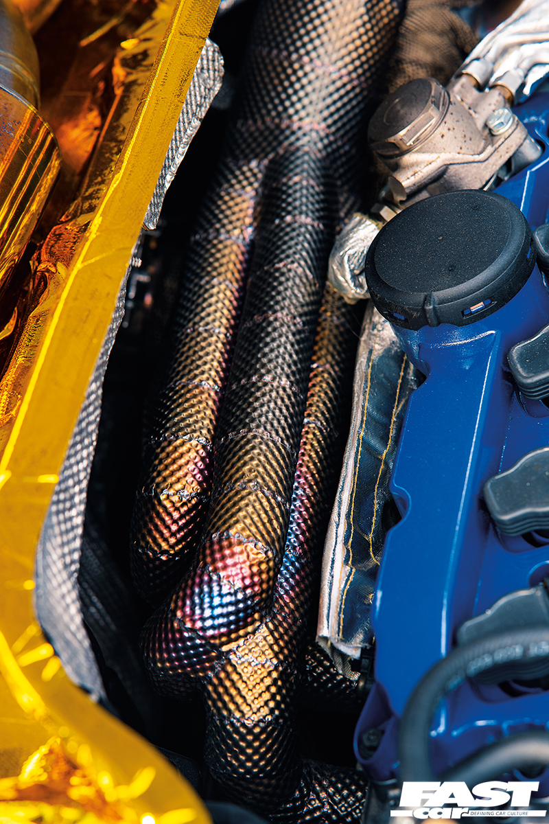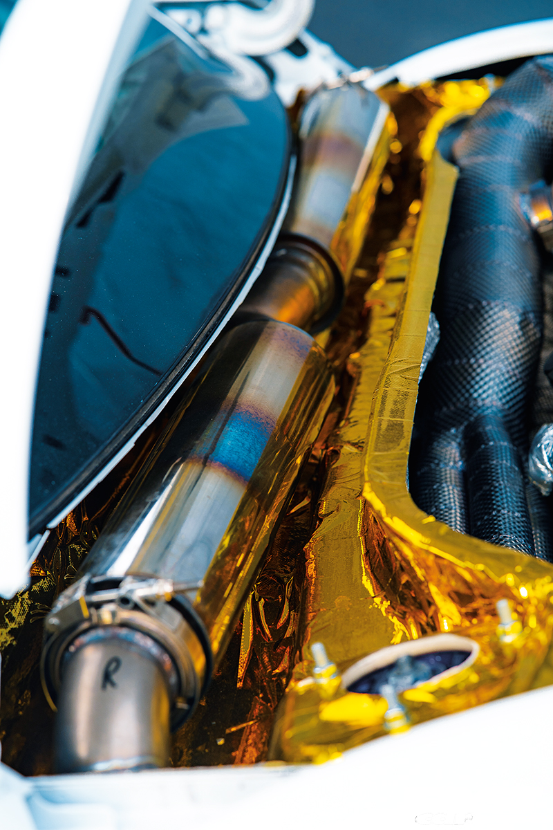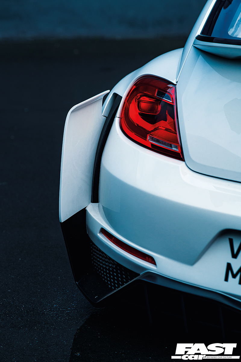 In the game, the widebody VW Beetle sports a 2.0-litre TFSI four-cylinder engine and a seven-speed DSG box but a degree of poetic licence has been utilised with this realisation. JP had the 2.5 five-cylinder Audi TTRS/Audi RS3 engine in stock and had been waiting for a suitable car to use it in: “It’s a fully built engine with uprated bearings, rods and pistons. The car retains stock cams. Whilst I wanted the car to have a good turn of pace, I have not gone over the top with it being front-wheel drive. Traction is aided with the huge 22” wheels. The car runs an uprated turbo which we have side-mounted on a custom manifold, this looks great, but it caused even more of a headache for the routing of the exhaust. The exhaust needed to exit out of the apertures on the widened front fenders on both sides. To achieve this, you’ll note that it goes partially behind the dashboard and then snakes into the compartment that usually houses the windscreen wiper assembly. The surrounding area has been carefully coated in gold heatproofing and the exhaust itself is expertly wrapped with Thermo Tech heat wrap to keep things safe. With the exhaust exiting out of the fender just forward of the door, the issue we have with heat is remembering that when the car is running you can’t just pop off for a chat with the door open as it quickly starts melting the door card! Despite this slight inconvenience the exhaust must be my favourite part of the build. Driving along and seeing the flames shoot out right next to your head, that’s a crazy new experience!”