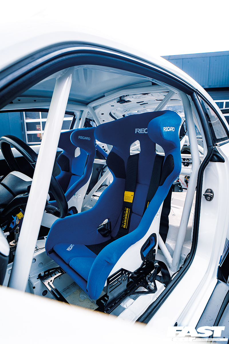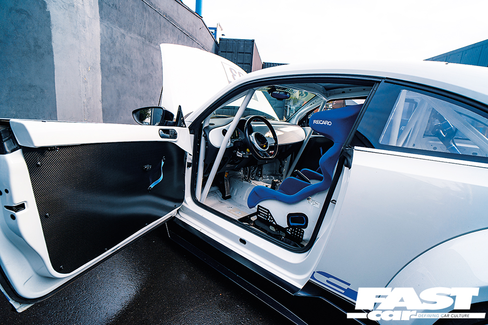 Full custom cage, bespoke smoothed dashboard plinth finished in body colour white, racing digital instrument cluster, Recaro Pro Racer Seats in blue on fixed mounts, Schroth harnesses, carbon fibre door cards, blue door pulls, battery relocated to spare wheel well