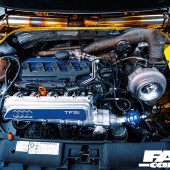 2.5 five-cylinder turbo from an Audi TTRS, custom manifold to side mount uprated turbo, uprated bearings, conrods and pistons, stock cams, BOV, custom exhaust with twin exit at each fender, front-mounted WT intercooler, gold heatproofing, Thermo Tech heat wrap on exhaust, engine cover badging finished in VW Motorsport Blue to match brake callipers, transmission: 7- speed DSG, FWD
