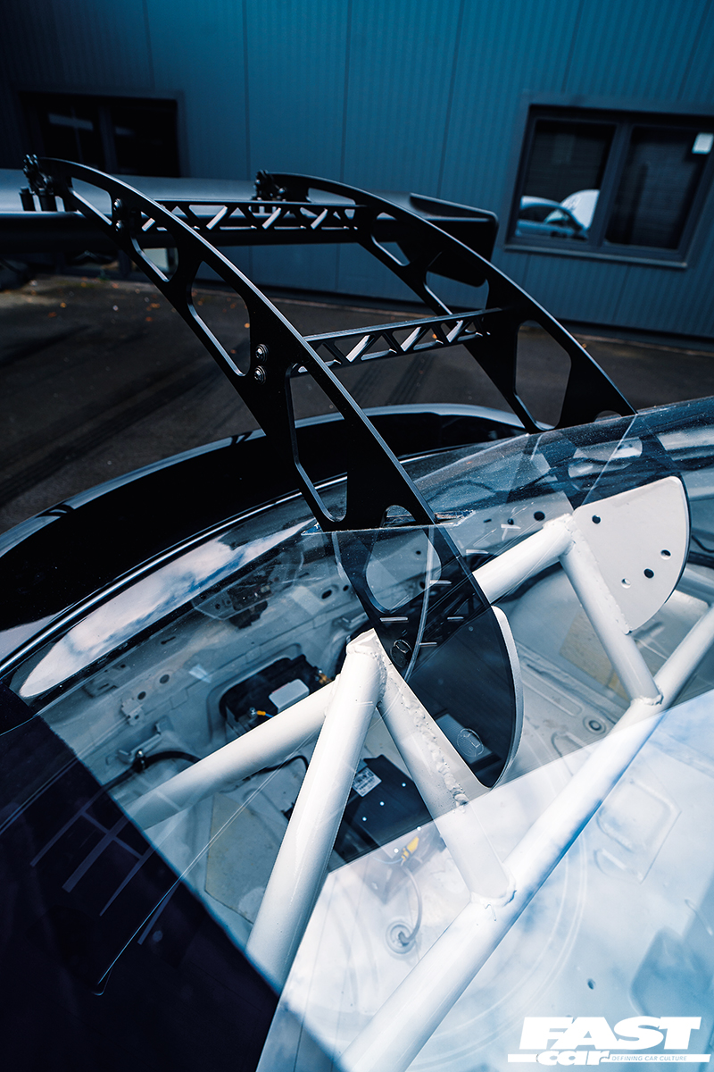 Going back to the wheels that JP mentions above, these were custom made by Rotiform. They are an exact replica of those used in Gran Turismo and utilise original data from the game. The 22” diameter matches the drama of the kit. KW coilovers have been fitted because of the good quality and ride of the product. Their Hydraulic Lift System (HLS) option that allows the front of the car to be lifted at the press of the button was a must with this car with it riding so low. An aggressive multipiece adjustable rear wing dominates the rear profile of the car and attaches to the bespoke roll cage through the openings in the custom Perspex rear screen.