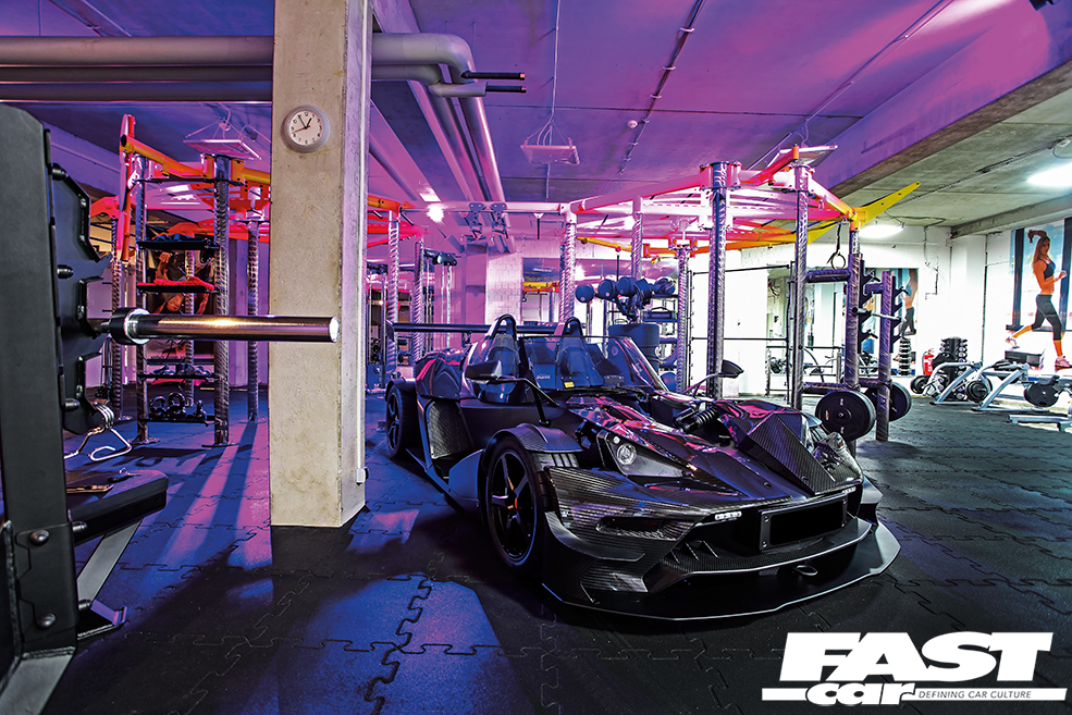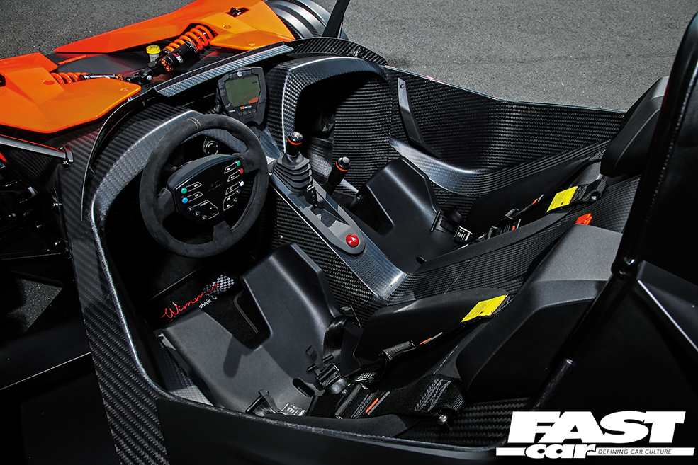 Another service that Wimmer RS can offer and is effectively demonstrated with this duo of bold brutes is through the endless way you can personally style your X-Bow to suit your own tastes. Take the manual, ‘R’-spec’d example (signified by its lack of windscreen meaning it’s the most focused, neck-snapping road-legal version KTM produces). Like the carbon fibre car, it features Wimmer’s ‘Aerodynamic Package 2’, that uses angular splitters and wings to instantly add a tonne more aggression to the overall aesthetic.