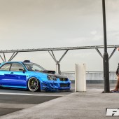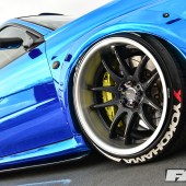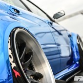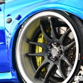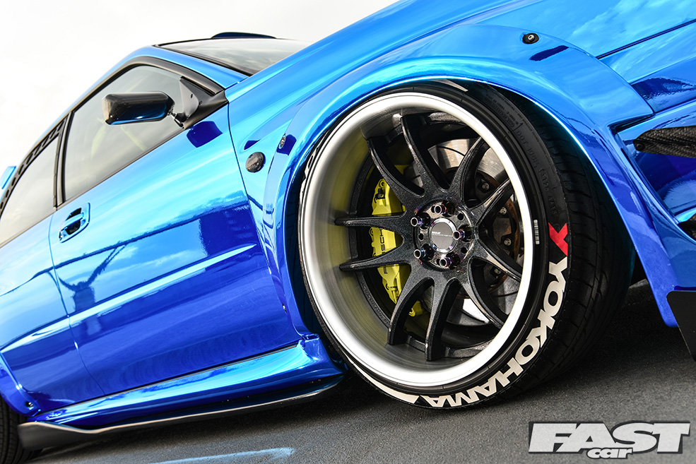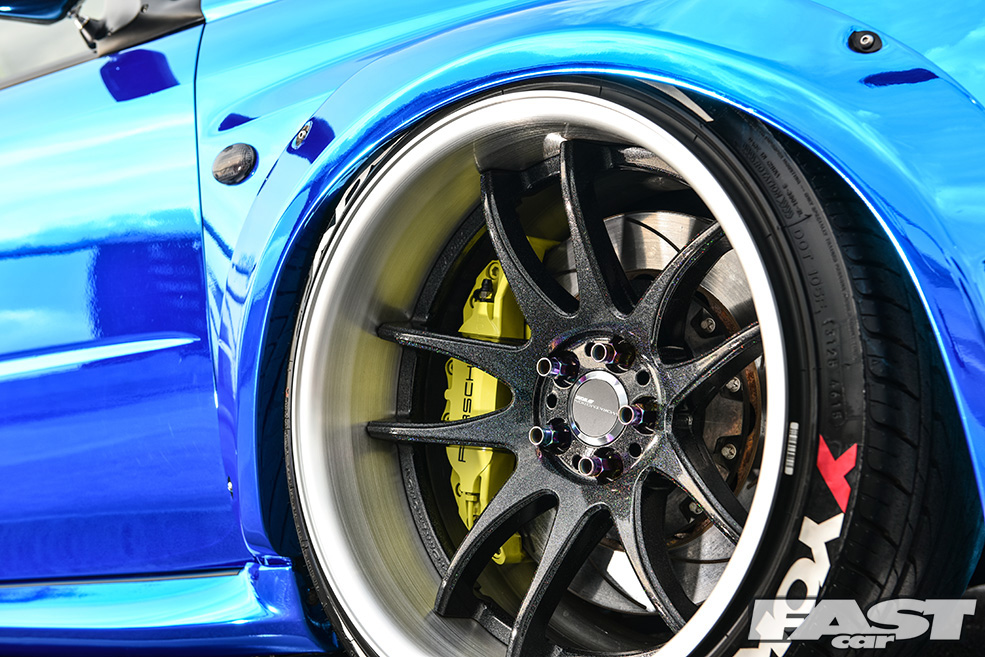11.5x18in ET-10 WORK Emotion CR-2P StanceNation Edition wheels with custom metalflake paint; 245/45 Yokohama Advans; 8-pot (front) and 6-pot (rear) Porsche callipers in Stabilo Boss luminous green; 360mm front discs; 330mm rear discs; stainless braided brake hoses; Air Lift V2 suspension; Cusco front and rear strut braces; Whiteline front and rear anti-roll bars.