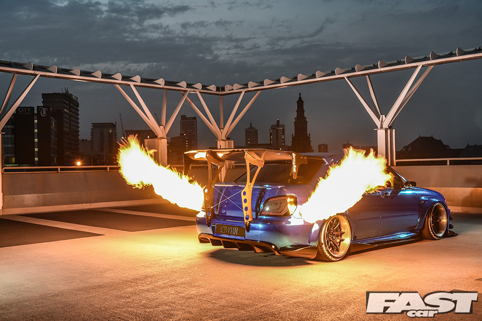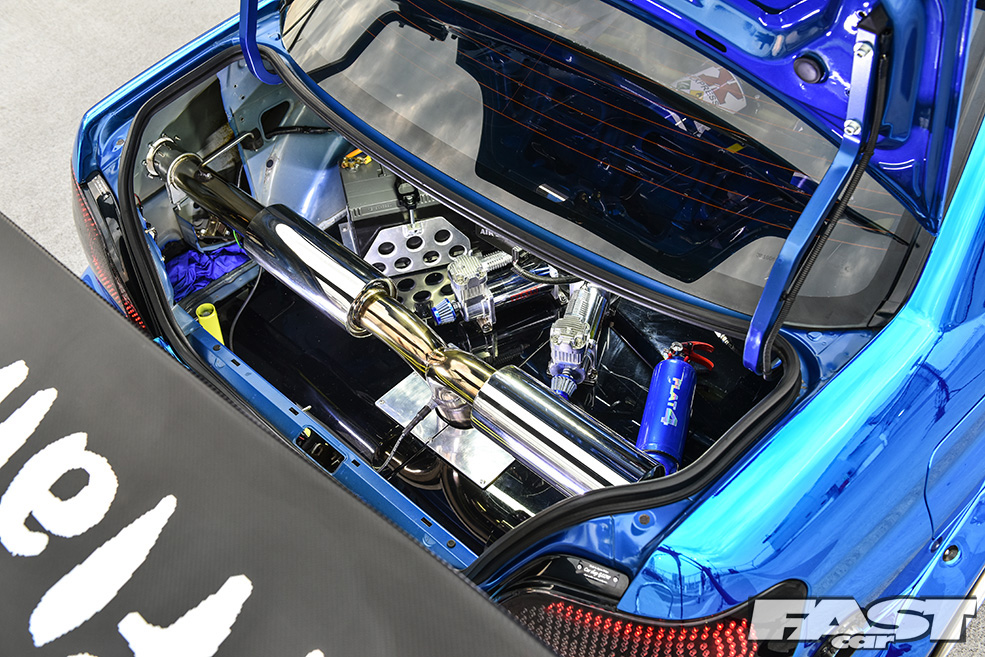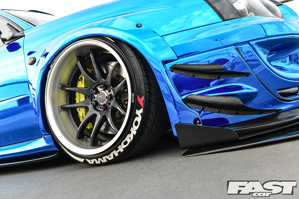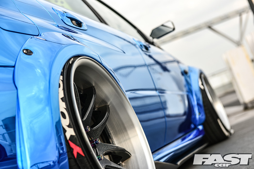 The exterior? That’s angry as all hell, with 60mm-wider arches at each corner covering up those fat new rims. There’s all manner of aero aids and custom carbon-fibre accoutrements, and the Spec C roof vent is a respectful nod to the model’s competition prowess. Rather less respectful but nonetheless hilariously awesome is that manga-esque rear wing and, of course, the staggering chrome wrap, which draws spectators at shows like bees to the proverbial honey pot.