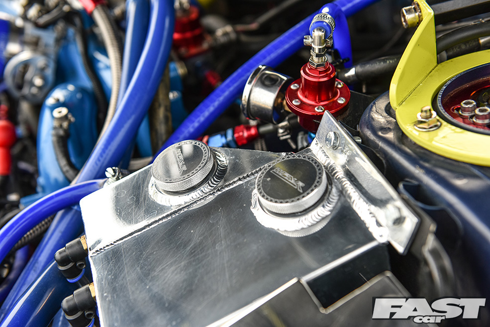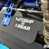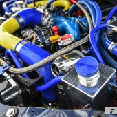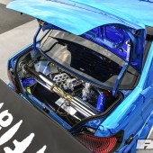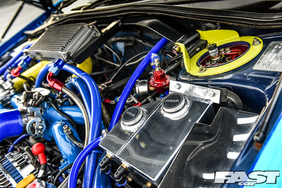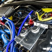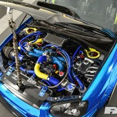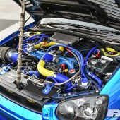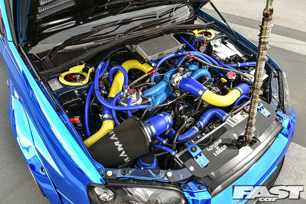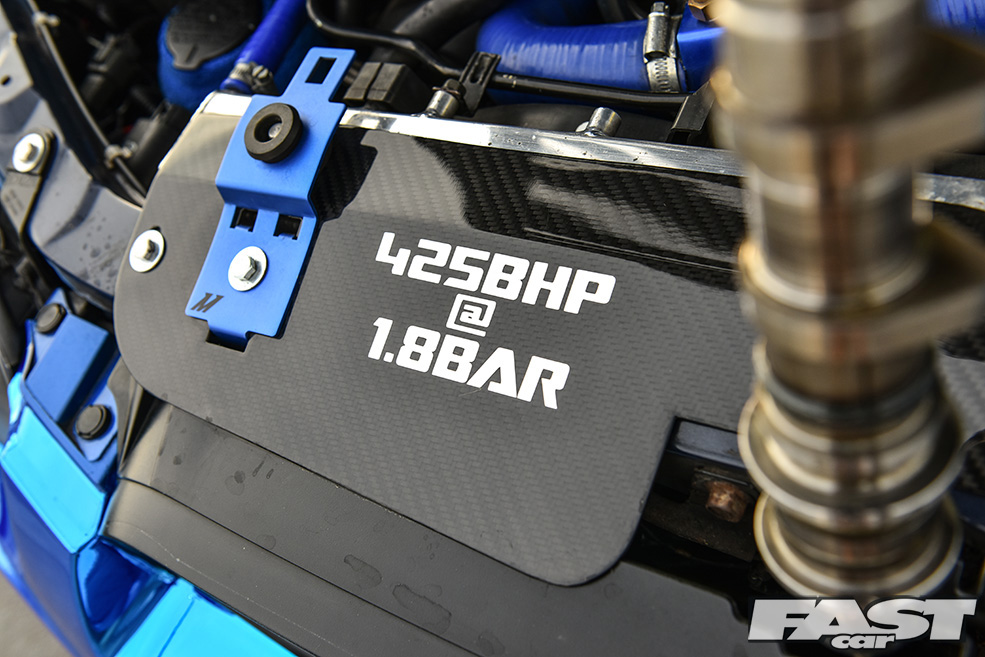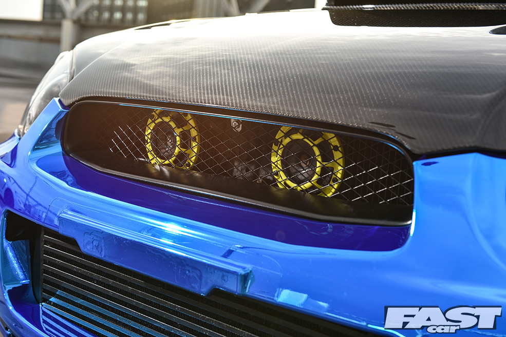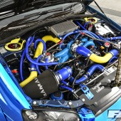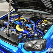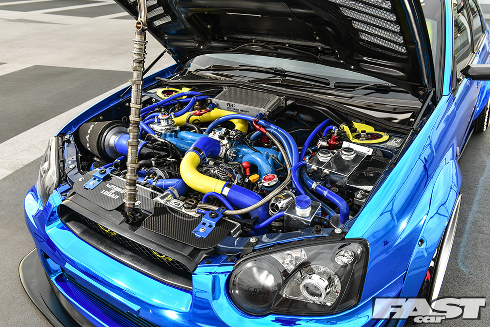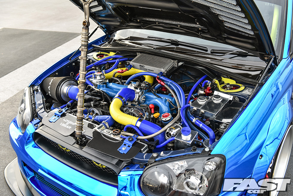 EJ20 flat-four, fully forged with nitrided crank, MD3210T turbo; American-made hard-pipe with big ram filter; reverse inlet manifold with quicker spool-up; Mocal oil cooler custom-made to fi t on Cusco front strut brace with custom braided oil lines; anti-lag, custom dual side-exit exhausts via boot – with dual flame-thrower mapped into ECU; HKS dump valve; polished oil catch can; Mishimoto radiator; Forge polished header tank, painted inlet manifold in Porsche Miami Blue; stainless steel pulleys; front mount intercooler with pipes painted in Stabilo Boss luminous green; RCM parallel fuel rails; upgraded injectors; fuel pressure regulator; 3-bar map sensor; polished alternator; polished washer bottle; polished expansion tank and fuse box cover; LED lighting to illuminate engine bay; 6-speed manual gearbox with ACT clutch and lightened flywheel; CAE short-shift 425bhp @ 1.8 bar.