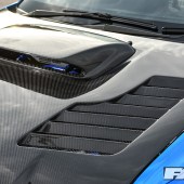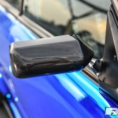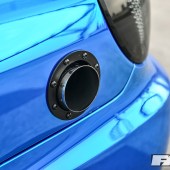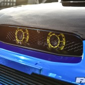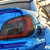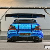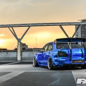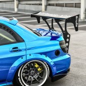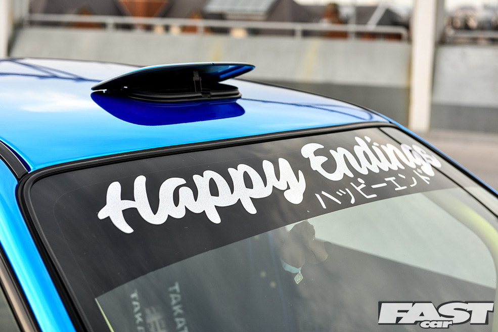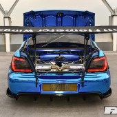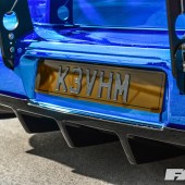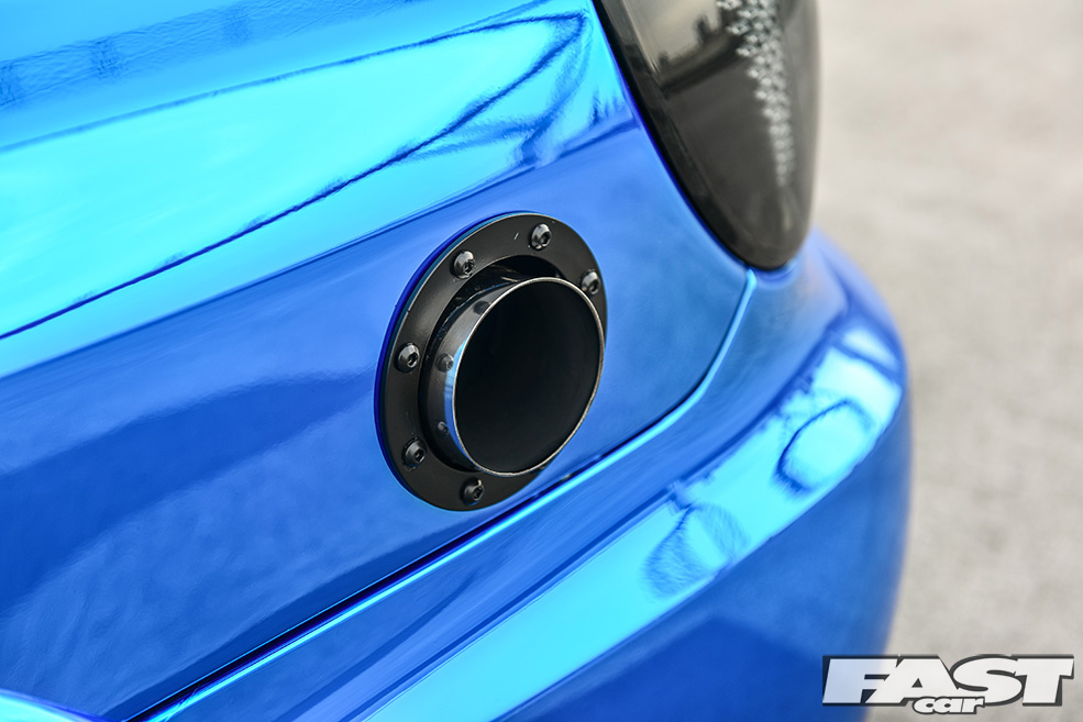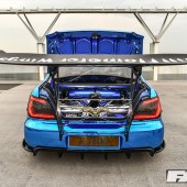 Chrome Blue wrap; +60mm wide arches with polished bolts; custom front bumper with Chargespeed foglight ducts; carbon-fibre canards; custom splitters, debadged front grille; Hella horns painted in Stabilo Boss luminous green; custom headlights with projectors and painted inserts in black; carbon-fibre vented and scooped bonnet; smoked indicators; Japanese carbon-fibre racing wing mirrors; Chargespeed side-skirt extensions; custom rally Spec C roof vent; rear window vents from USA; rear upper window spoiler; custom black exhaust surrounds with matching bolts; Battle Aero rear wing with custom wires and bar; flushed boot with Spec D rear spoiler; JDM rear LED lights – handmade with custom indicator sweeping; rear diffuser with corner extensions.