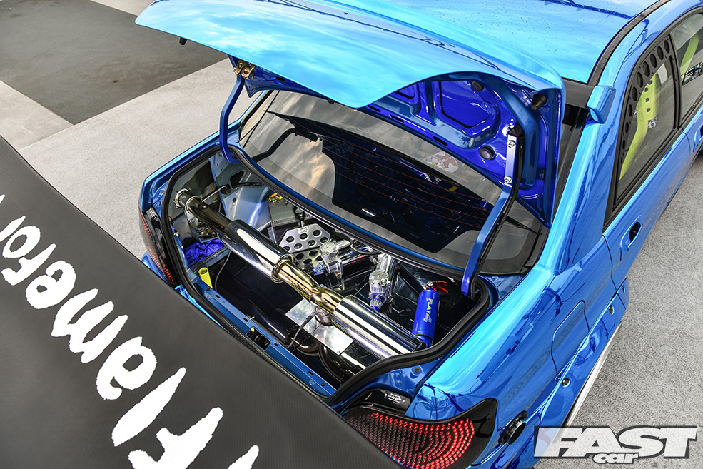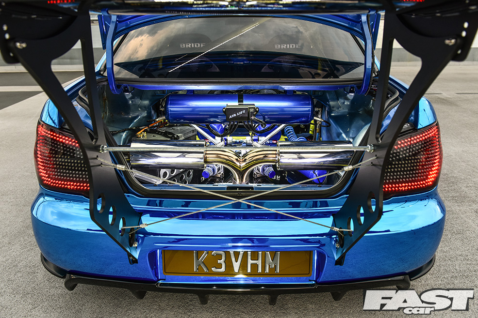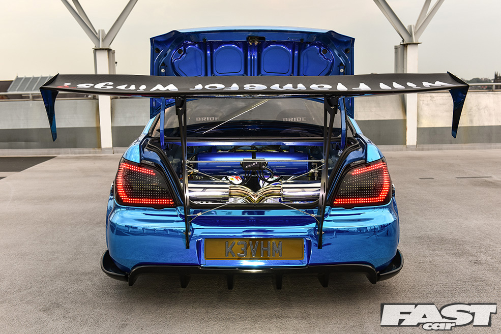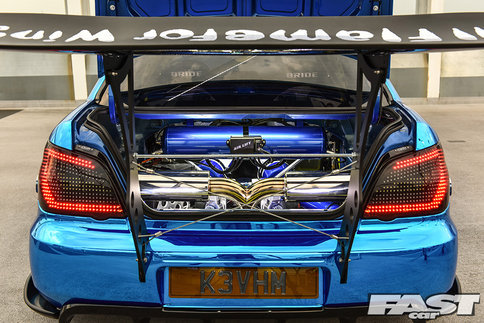 Now, on any other car you might expect a dazzling platter of luminous highlights to be the standout talking point, but this quirky Subaru isn’t just any other car. In fact, it’s one of the most comprehensively modded motors on the scene today – hence its justly deserved spot on our cover this month. Kev’s left no stone unturned in his quest for uniqueness, leaving us with a car which offers not one but many headline-grabbing features: you could talk to your mates about ‘that chrome blue Impreza’, or ‘that bagged Impreza on the WORK rims’, or ‘that Impreza with the colossal rear wing and the flamethrower’ and there’s a decent chance that they’d know which car you were talking about. This outstanding machine sparkles like a jewel in the modern Fast Car scene. And given the rich quality of builds out