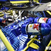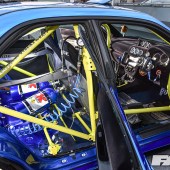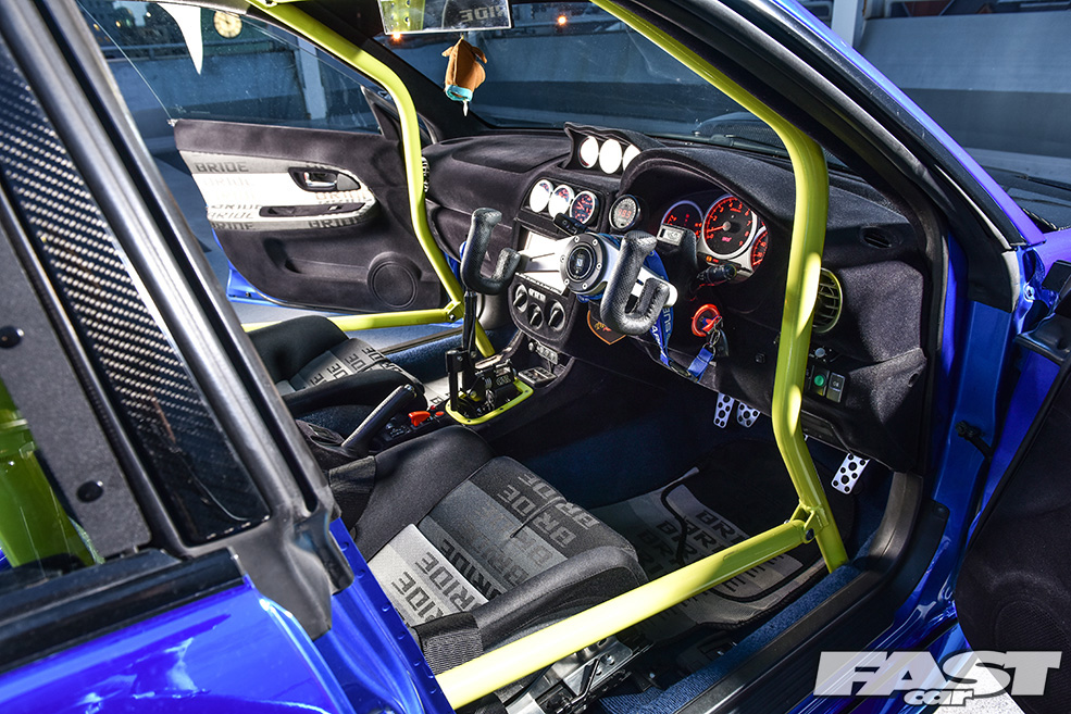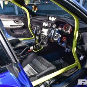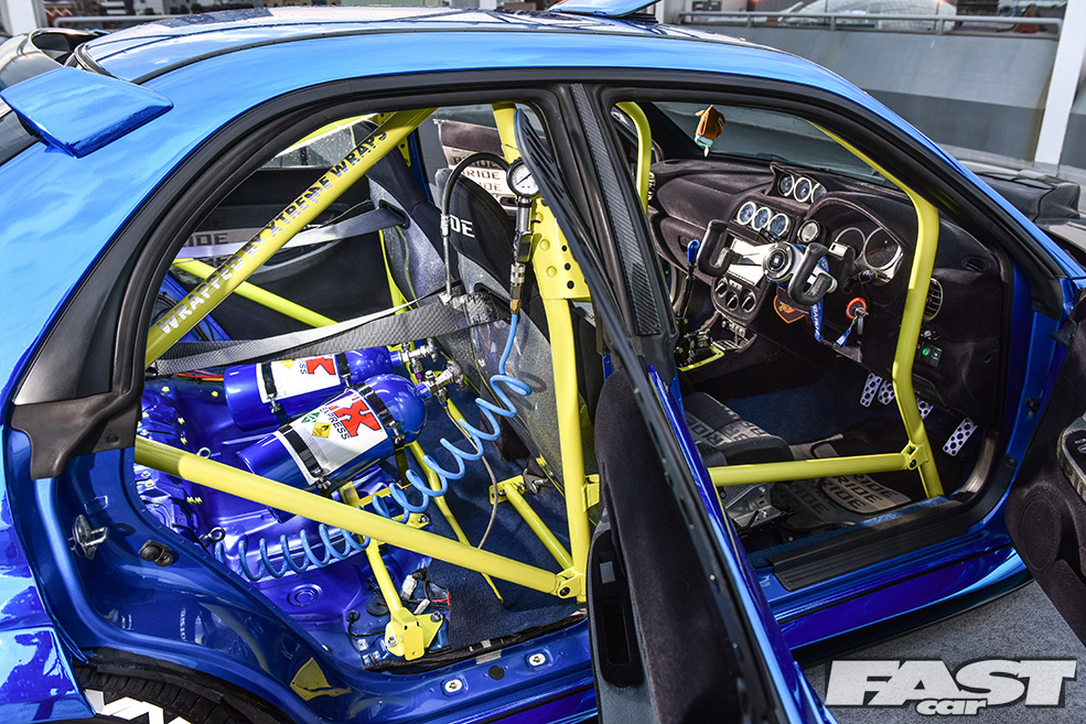 Flocked dash (including glovebox and centre console); 12-point Cusco rollcage painted Stabilo Boss luminous green; 6 Defi amber sweeping digital gauges with custom centre pod; centre air vents removed and replaced with 3 gauges in custom pod; custom inlet temperature gauge; Innovate air/fuel ratio digital gauge; STi amber sweeping gauge (from 2006 STi model); jet fighter-style steering wheel; NRG snap-off boss; CAE shifter with blue knob; custom STi gear surround; Bride Low Max fixed bucket seats with glitter painted rears; flocked doorcards including window switches – with Bride inserts; flocked C-pillar trims; Bride carpet mats; Alpine entertainment system with Carlson door speakers; wide rear-view mirror; twin blue-painted NOS bottles on custom stand; dual fuel pumps with custom braided fuel lines; custom aluminium gloss black boot floor with polished centre; painted and custom-fitted air tank with tyre inflator attachment; Air Lift manifold on show with rerouted wiring; painted fi re extinguisher with custom bracket; twin compressors with custom air filters.