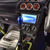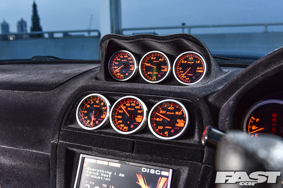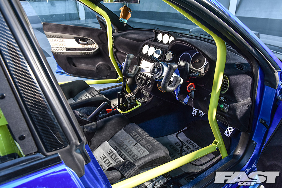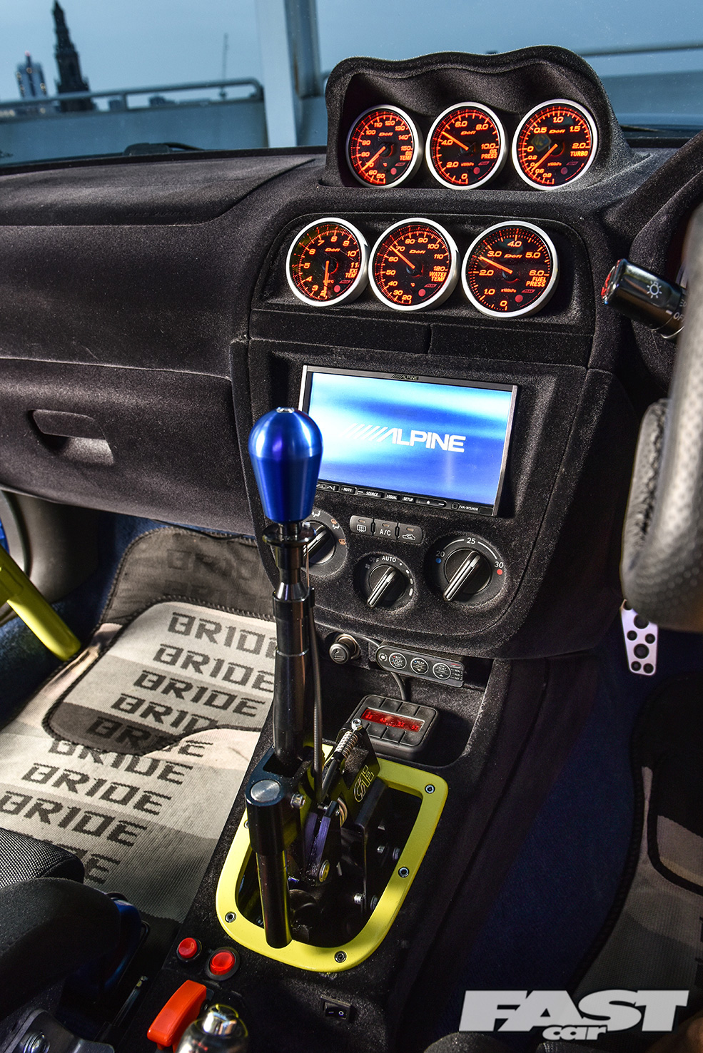 If you’ve gone this far with a build, you can’t sideline the interior. No danger of that here, as Kev’s thrown in a full 12-point rollcage and flocked pretty much everything possible, before bolting in a pair of custom Bride seats and liberally sprinkling the place with handy gauges. It really is a polymath, this car. It can do everything, and nothing’s been ignored.