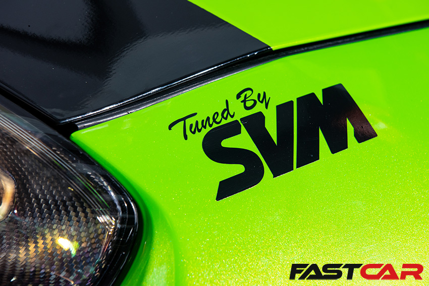 Full respray in Lamborghini Verde Ithaca Green, front carbon canards, full carbon roof, custom carbon-lined headlights with halos and HIDs, iJDMToy LED side lights, quick release bonnet latches, modified bonnet vents, 11-2016 front bumper, SVM race livery, rear carbon diffuser, rear duckbill spoiler boot lid, Difflow Sharp rear diffuser fins, rear bumper drilled with air relief vents, parachute casing and hardware