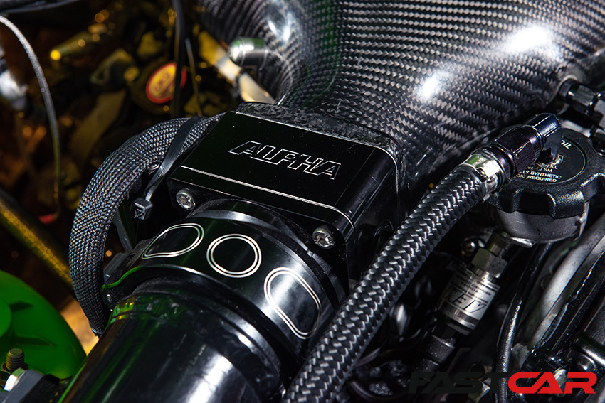 4.0-litre, 6-cyl, 32v VR38, AMS Omega-spec billet block, forged pistons, rods bearings, head and main studs, crank pulley, oil pan, billet crank, cylinder sleeves, CNC ported race head, Omega-spec valves, springs and retainers, camshafts and timing components, carbon/billet intake manifold with 12 1700cc ID injectors, AMS race front mount intercooler and hard pipe kit, Kinsler TP1300 Series 2 15gpm fuel pump, AMS throttle body set, TiAL bovs, Alpha 22 turbo Kit (with twin 76mm turbos), K&N air filters, Alpha 22 downpipes with full custom 102mm SVM exhaust system, Syvecs S8 ECU, GT1R methanol fuel system kit, Jazz Race fuel tank