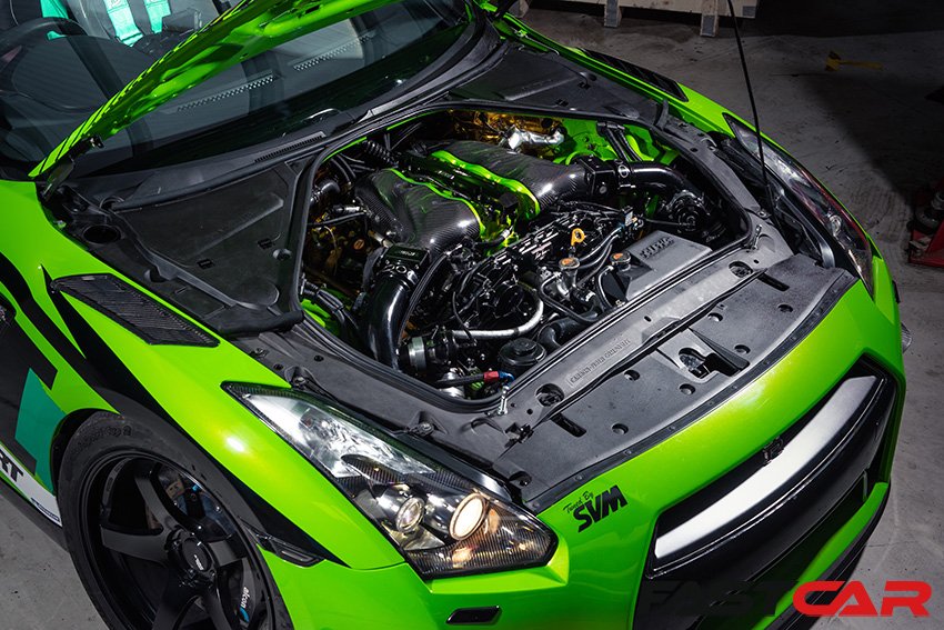 Making a 3.8-litre engine, even one as potent as the VR38, produce over 2500bhp is no easy task. To accomplish this feat, SVM’s Hulk is equipped with a fully built 4.0-litre forged engine complete with an Omega-spec billet block from AMS Performance. This uses a billet crank and a CNC ported race heads with Omega spec camshafts. Feeding this bulletproof motor with air is a pair of Alpha 22 76mm turbos, which can flow up to 60Psi (4.1 bar) of boost through a huge 6in thick AMS intercooler.