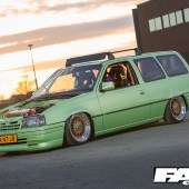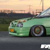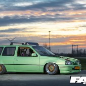 Custom green paint, Kamei front spoiler, GSi bumpers, Astra F door handles, tinted headlights and indicators, Irmscher taillights.