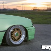 8×16” ET28 BBS RS wheels with 1.5” lips, custom Air Lift Performance air-ride with 3P management, Koni rear shocks, raised front top-mounts, polybushed throughout, rear disc conversion.