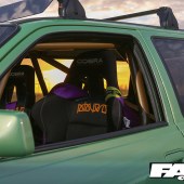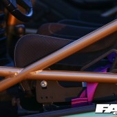 Retrim in cloth/Alcantara, Cobra bucket seats with custom Players/Air Lift branding, Beltenick 5-point harnesses, custom rollcage in gold with bolt-in door bars, Opel Motorsport steering wheel, stripped rear with custom flat floor.