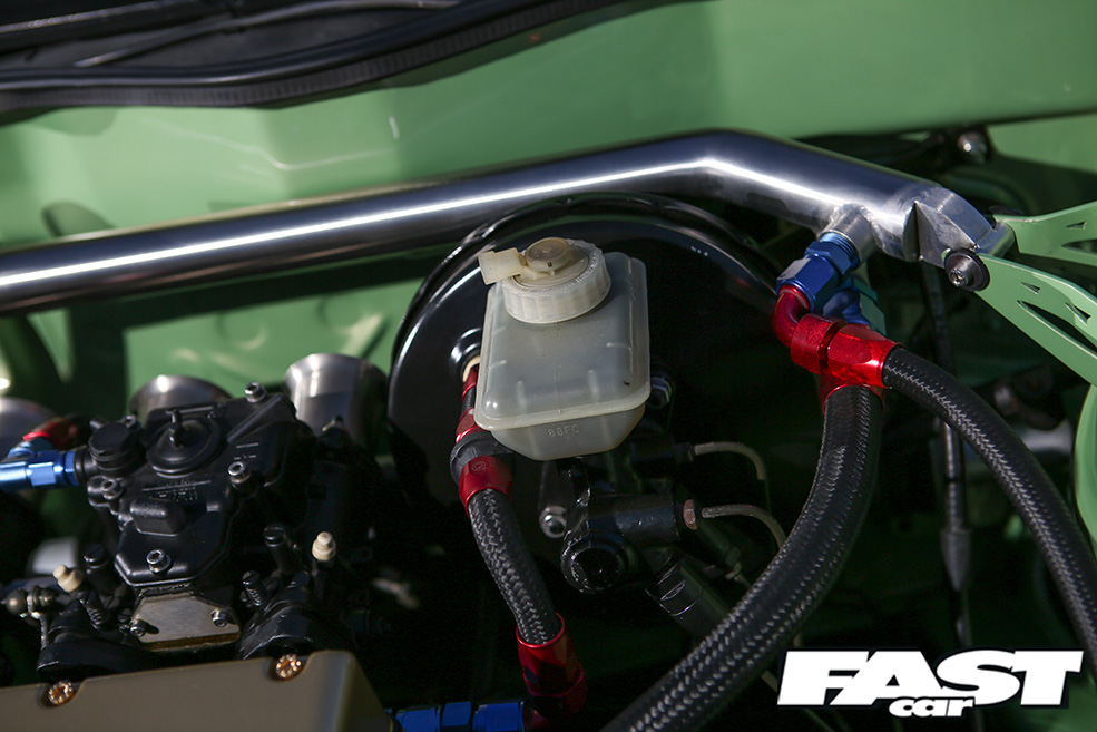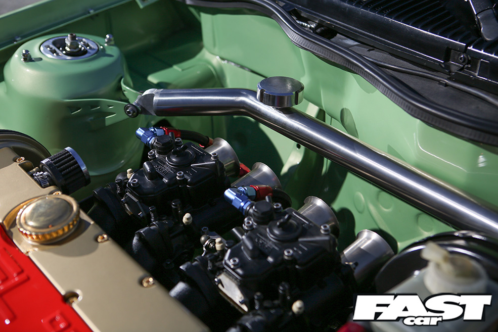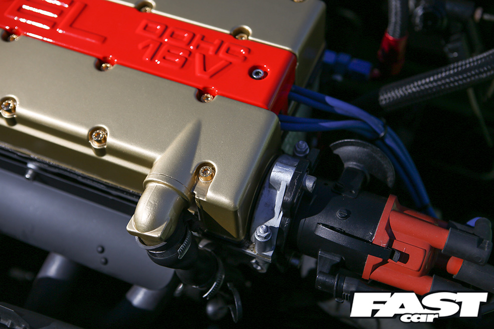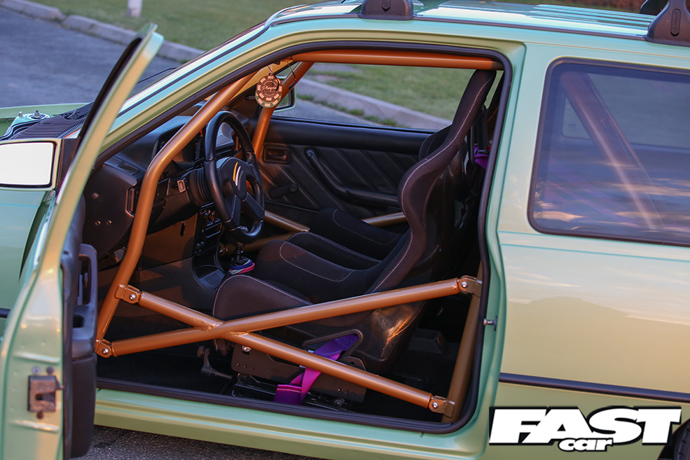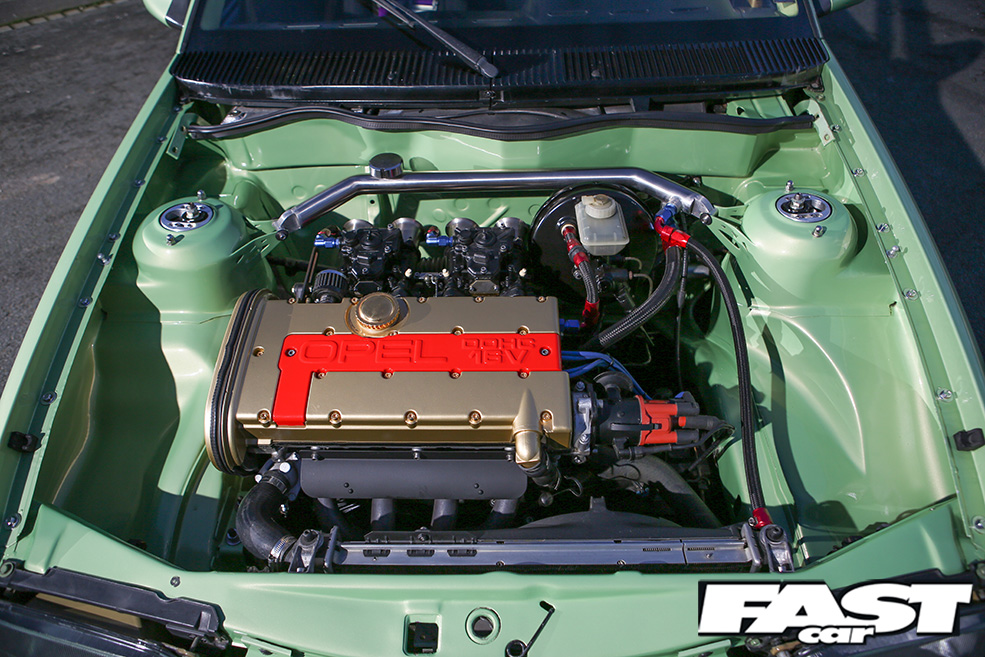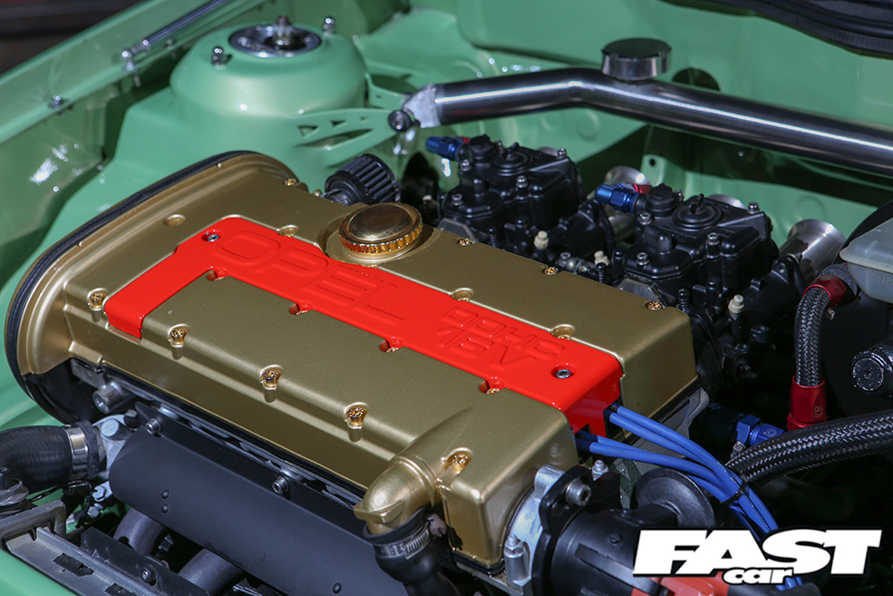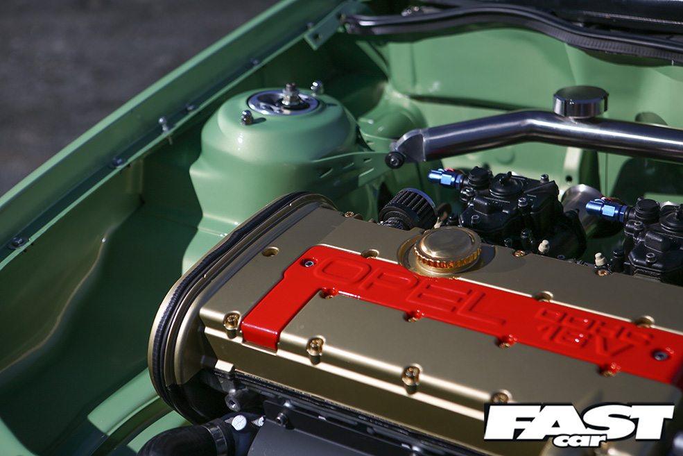 2.0-litre 16v XE, twin Weber carbs, custom 55mm stainless steel exhaust system with Simons silencers, shaved engine bay with fluid reservoirs and battery relocated.