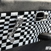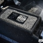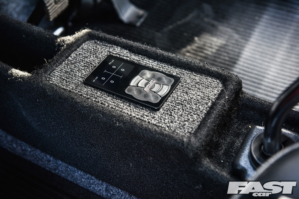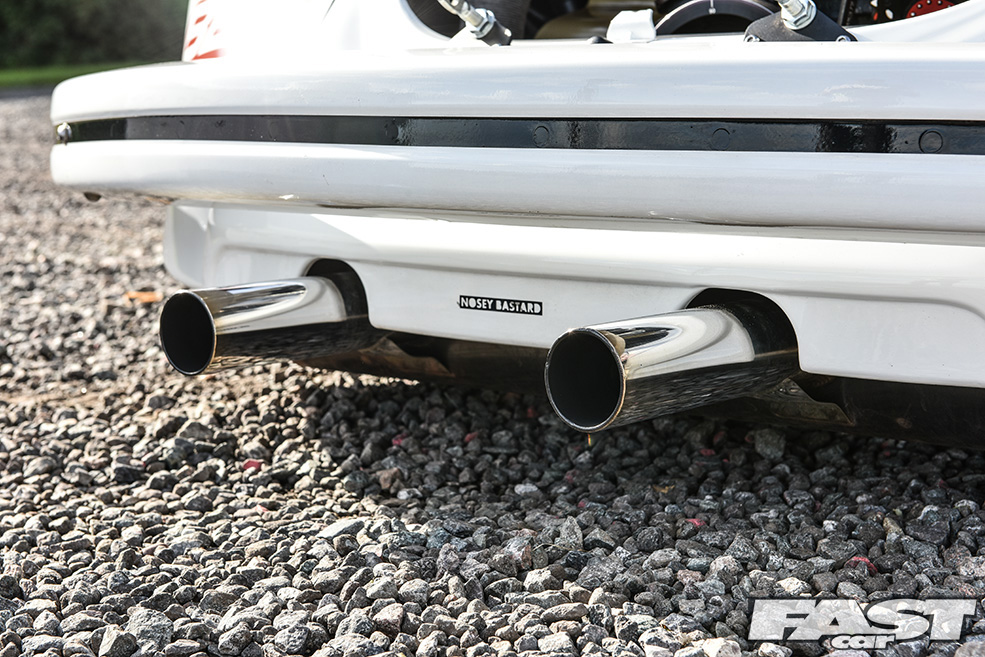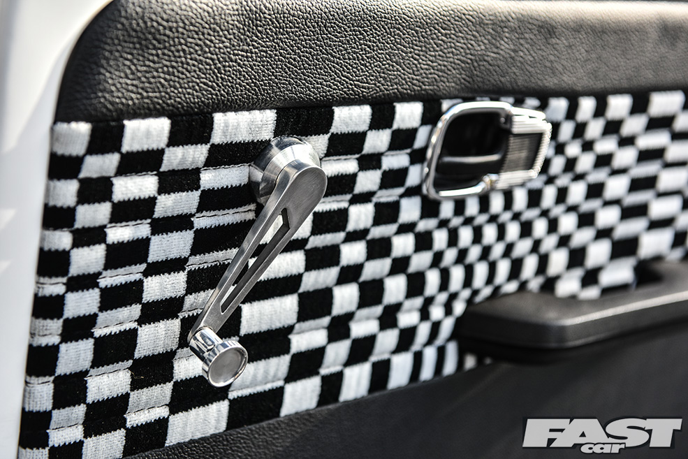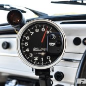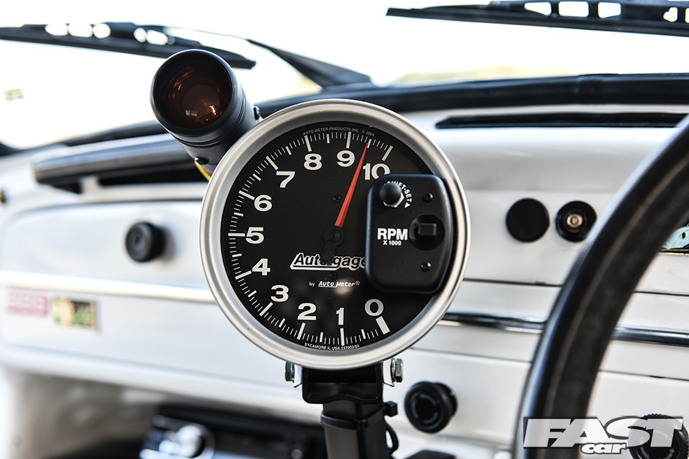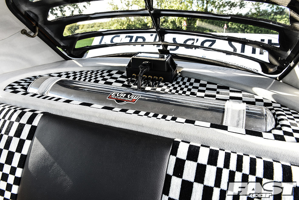 The need to complete the look and to do the rest of the car justice saw Max turn his attention to another area, the interior. This was perhaps the area of the car most in need of real work when Max first bought it, and he wisely opted to continue the Porsche theme in a big way, hence the full re-trim in leather and genuine Porsche Pasha material by Ed Aldridge. There’s more Pasha on the door cards and parcel shelf (home to air management build – more on that in a moment), plus grey alcantara for the headlining, an early (not to mention hard won) early Porsche 924 2-spoke wheel, a genuine Hurst shifter and a not inconsiderable Auto Meter tacho guage.