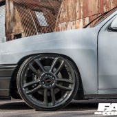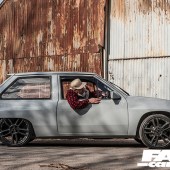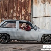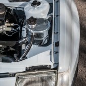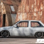 7×18” MINI John Cooper Works R109 wheels (painted Volvo Grey to match bumpers) with polished hardware, 165/35 Nankang AS-1 tyres, 25mm (front) and 20mm (rear) Direnza adaptors, TA Technix air-ride suspension (air tank installed on floating bracket in boot with hardlines piped to manifold), shocks painted beige to match engine cover and brakes, Powerflex bushes throughout, rear anti-roll bar, strengthened front arms, Wilwood 4-pot Midilite calipers, Polymatrix Q pads, 284mm vented discs, carbon sleeved HEL braided hoses, new brake lines throughout, GSi brake servo, GSi drums and new shoes on rear, full chassis strengthening kit
