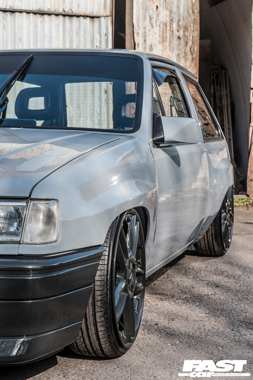 1992 Nova Fun 1.2i shell, Ford Storm Grey (ST200) paint, GSi bumpers painted Volvo Grey, GSi boot spoiler, Mk1 Nova tailgate (de-locked and de-wipered), Cool Louvres pressed bonnet, flushed doors with remote poppers, blended-in 30mm-wider S.I.D. wide-arch kit, inner arches all cut and re-welded to allow larger wheels and height drop, Opel wind deflectors, fuel filler relocated into door shut, fully smoothed engine bay and slam panel, GSi window trim, red tinted rear lights, new sills and front valance