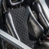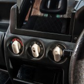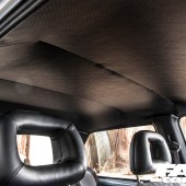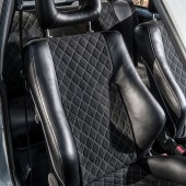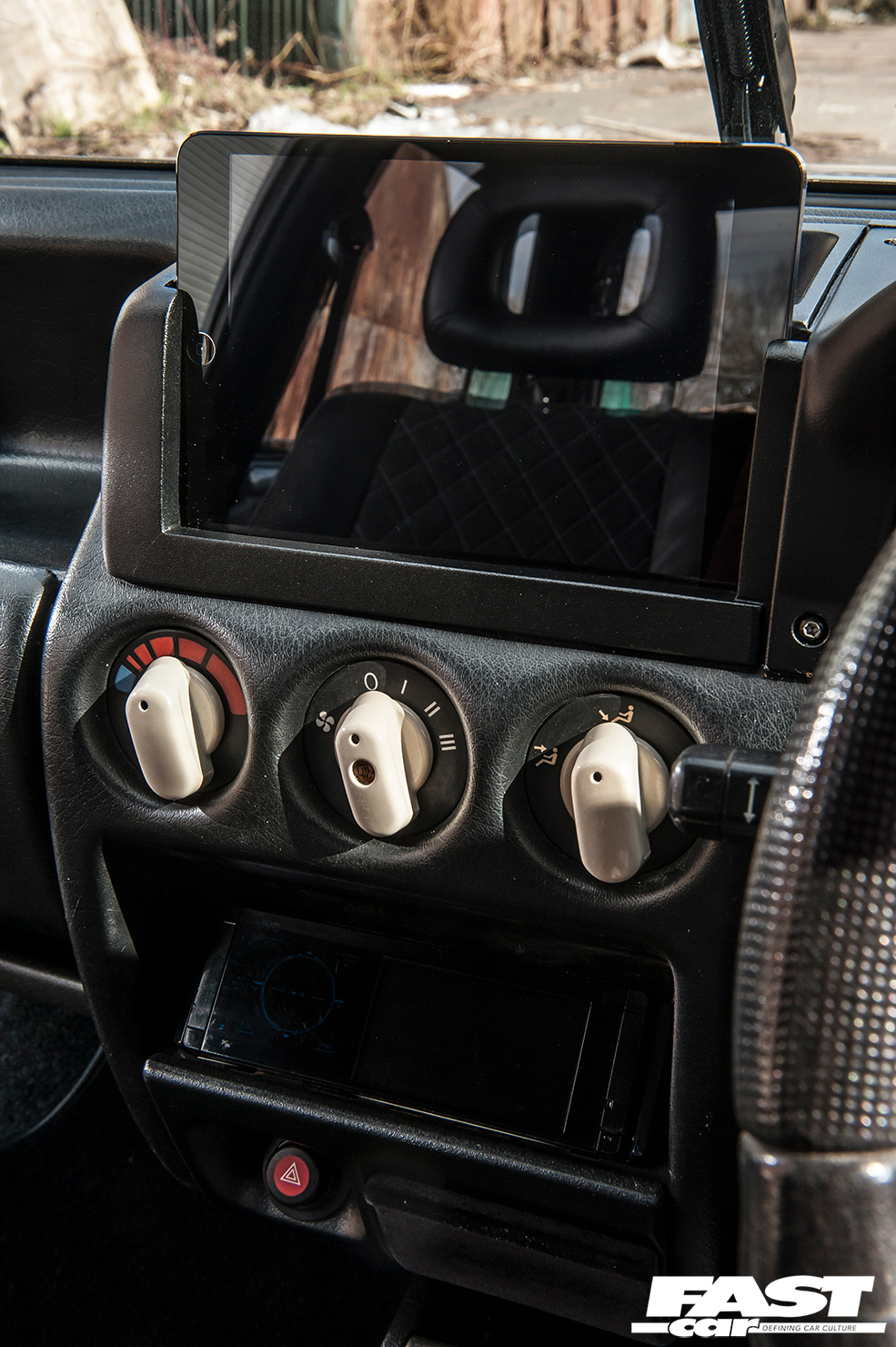 Full leather/Alcantara black-and-grey retrim on SR seats and doorcards with grey diamond stitch, custom rear cards to allow fuel filler pipe, front handles removed, leather handbrake cover to match seats, GSi black centre console, speakers hidden inside doors and dash, GSi black dash and full GSi interior trim, black perforated leather headliner and sun visors, control knobs painted beige, black painted pillar trims, blacked-out parcel shelf, Mk1 dark grey carpets, Richbrook black mats with black leather trim, acoustic dark grey covered trim on boot install, Nova-branded Momo steering wheel, Corsa B stalks, Sparco gearknob – painted beige, electric window conversion, Astra digi-dash conversion, custom iPad display mount, Dynamat sound deadening throughout