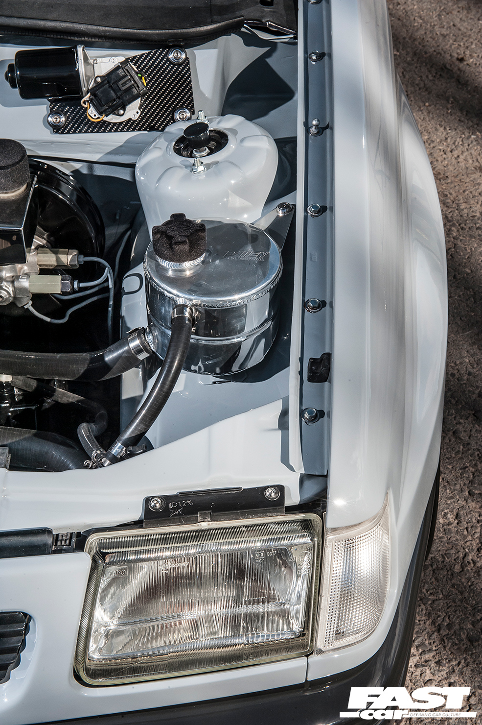 C20XE 2.0-litre DOHC 16v, stock internals with uprated INA followers, Irmscher Power Cap, beige cam cover and belt cover, gloss black head, block and gearbox, modified 120a alternator, lightweight pulley wheel, ARP rod bolts, custom-machined Vauxhall oil cap, 6” chrome air filter, Mocal short oil filter, heat-wrapped Cavalier manifold, Powerflow 3” stainless exhaust system, stainless bolts and chrome cover caps throughout, smoothed plug cover, full Roose Motorsport hose kit, stainless Kelsport heat shield, stainless water bar, stainless reservoir cover and flocked cap, GSi radiator and fan setup, stainless Bailey header tank with flocked cap, fully hidden wiring throughout engine bay (engine wiring tucked inside stainless tubes welded from lights to battery tray running through inner wings), F20 5-speed gearbox with short-shift linkage, LMF conversion hubs, 2.0 conversion shafts with 2.0 CVs all round, LUK clutch