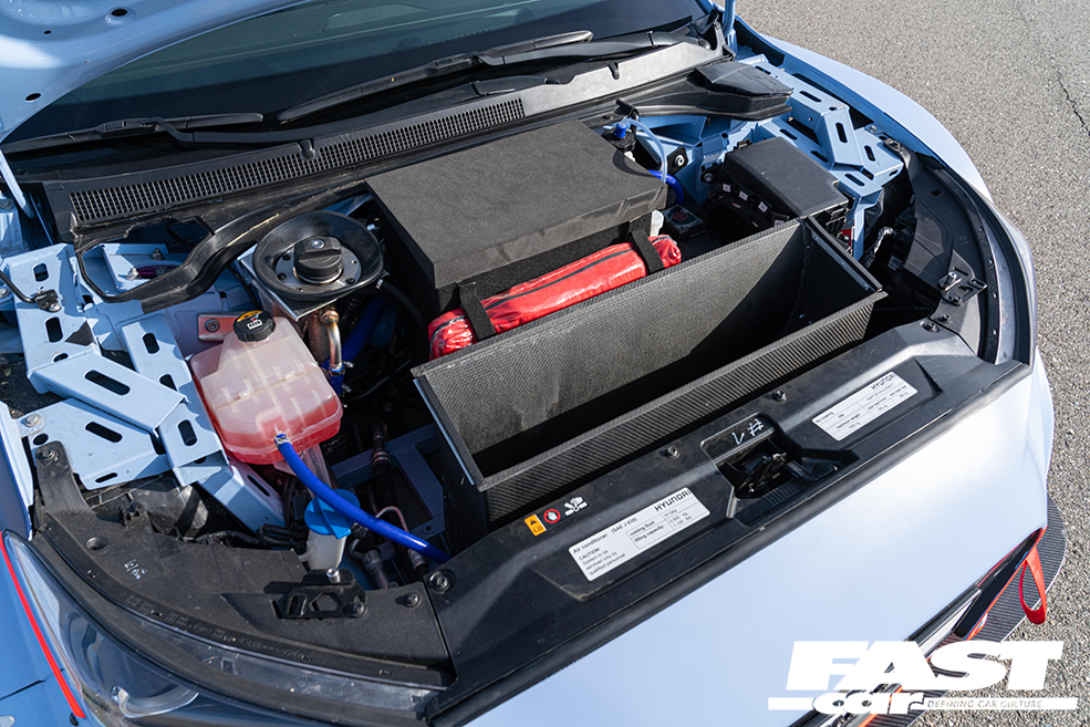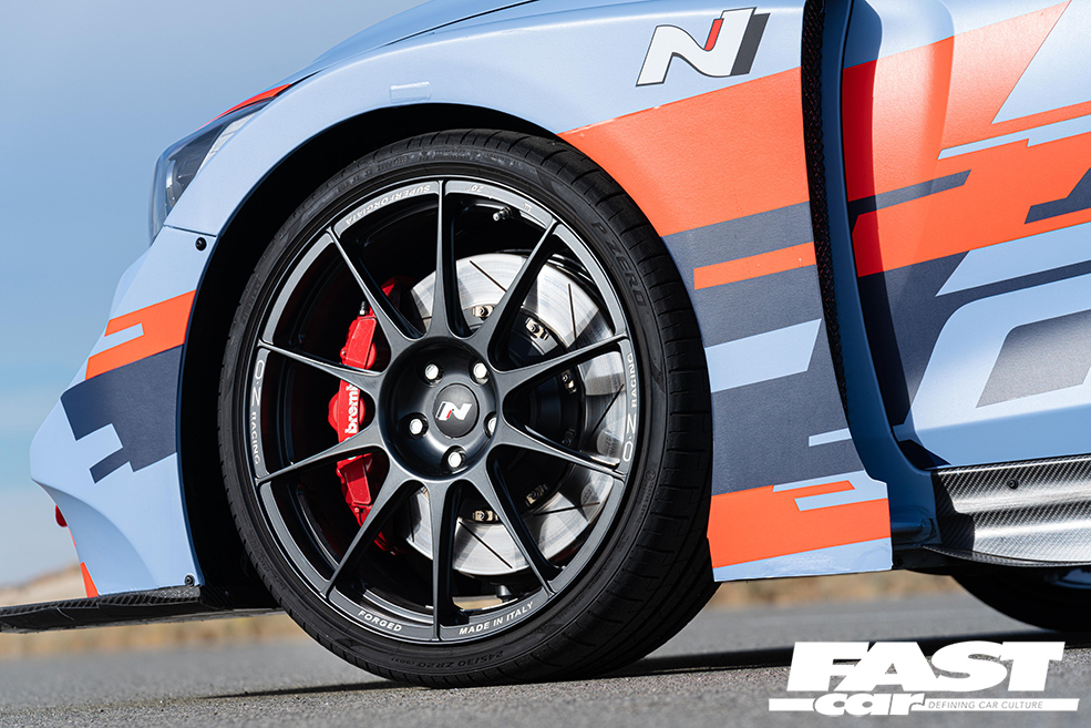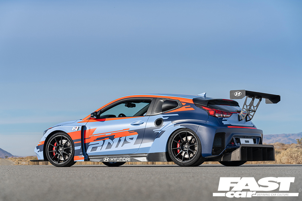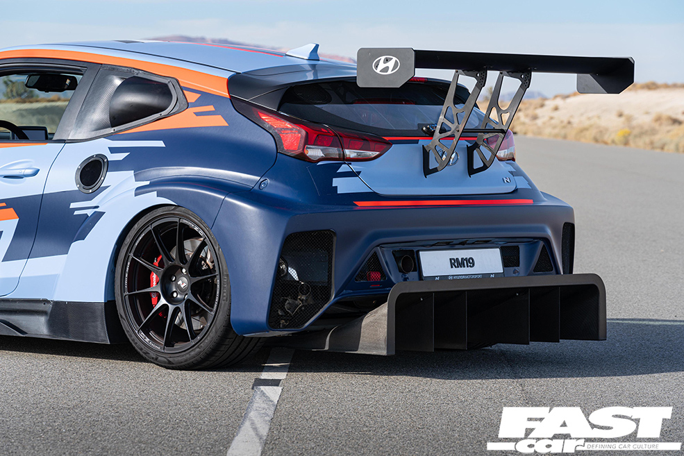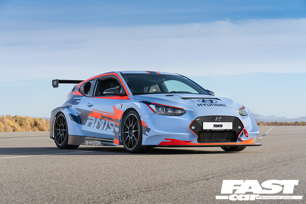 The RM19 Racing Midship Sports Car Prototype has a Touring Car engine shoved in the middle, a 2.0-litre four-pot kicking out 390bhp, which slingshots it to 62mph in under four seconds. The pumped-up Veloster shell has all sorts of crazy aero, and hiding underneath are a race-derived double-wishbone suspension setup, Touring Car sequential gearbox, and electronic LSD.