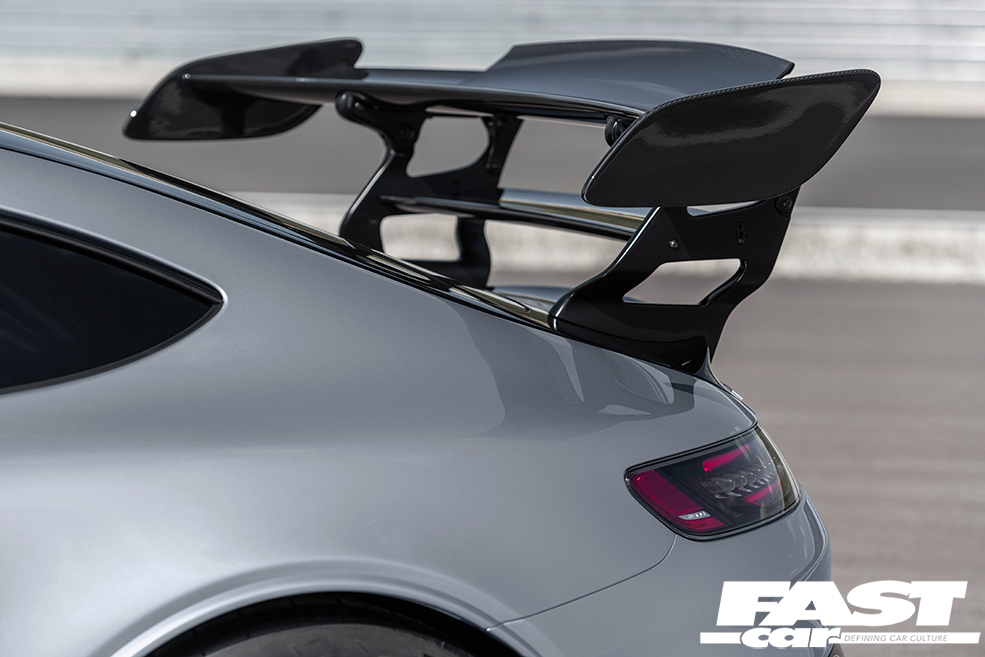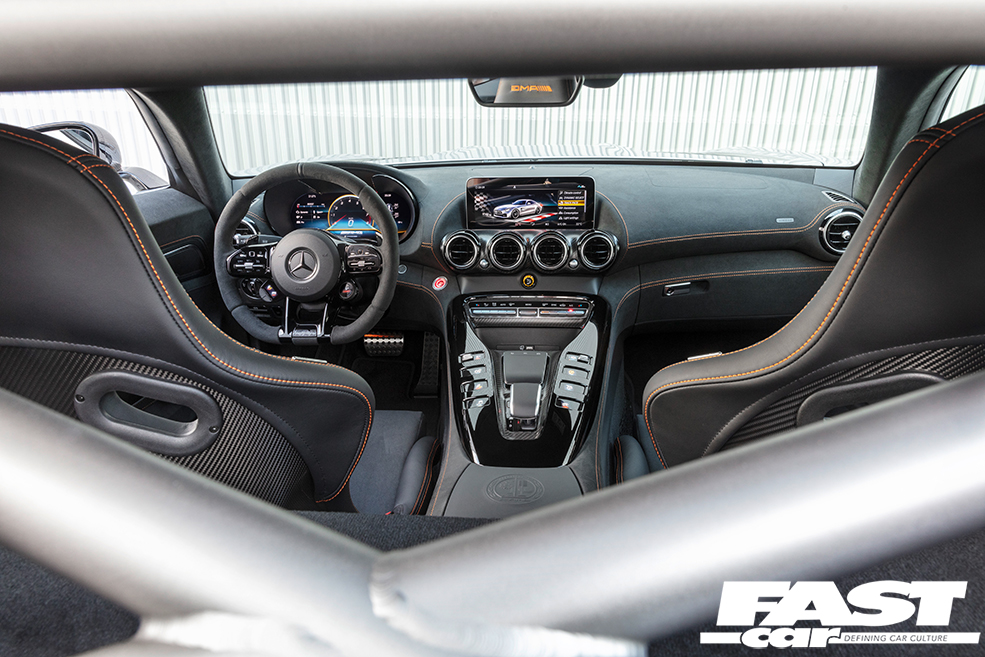 As you can imagine with a Black Series, the weight has also been reduced, some 35kg less than the GT R Pro at 1540kg. Thinner glass for the front and rear windows have been used as well as carbon fibre bucket seats, carbon bonnet, carbon wings, carbon tailgate and a carbon roof. You can opt for a track pack on top of this which brings in a titanium roll cage, four-point harnesses and a fire extinguisher.