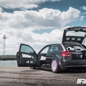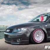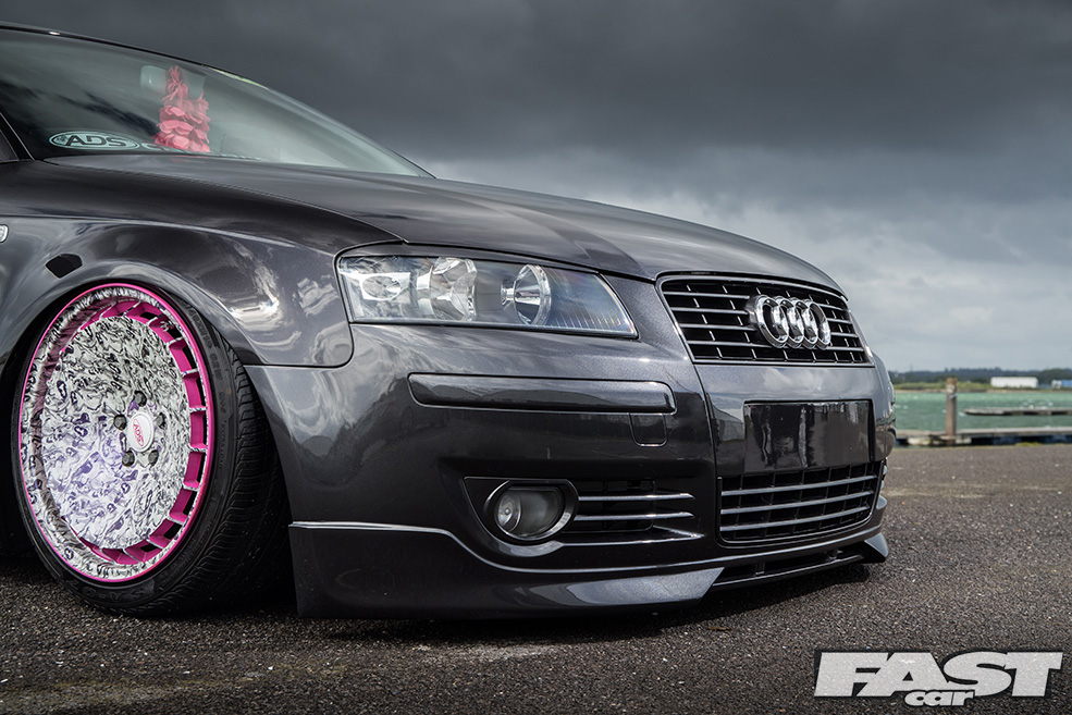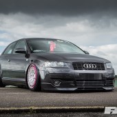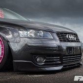OEM Audi Pearl Grey paintwork; colour-coded front grille, foglight surrounds and headlight eyebrows; smoothed lower front splitter; US-spec front indicators; 2011 A3 tail lights.