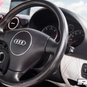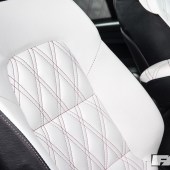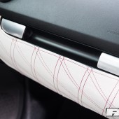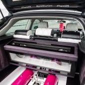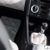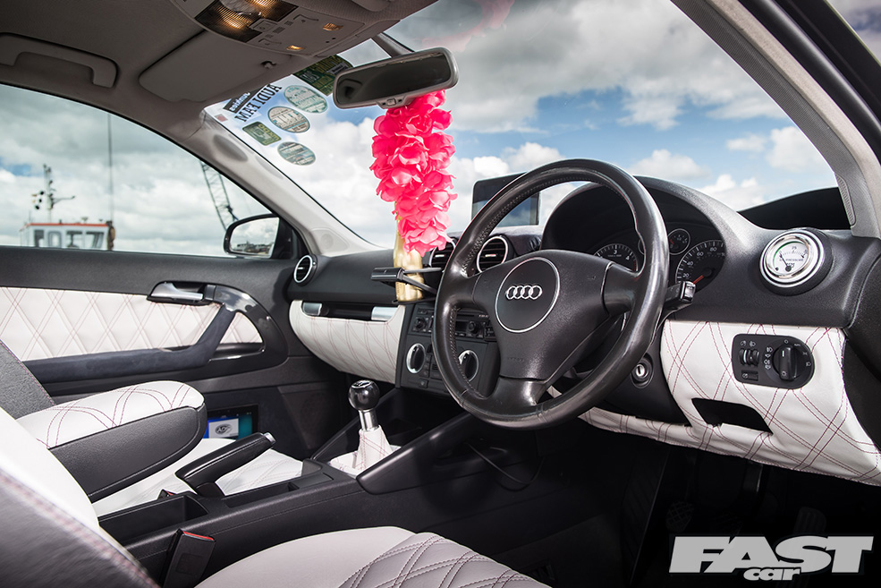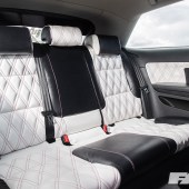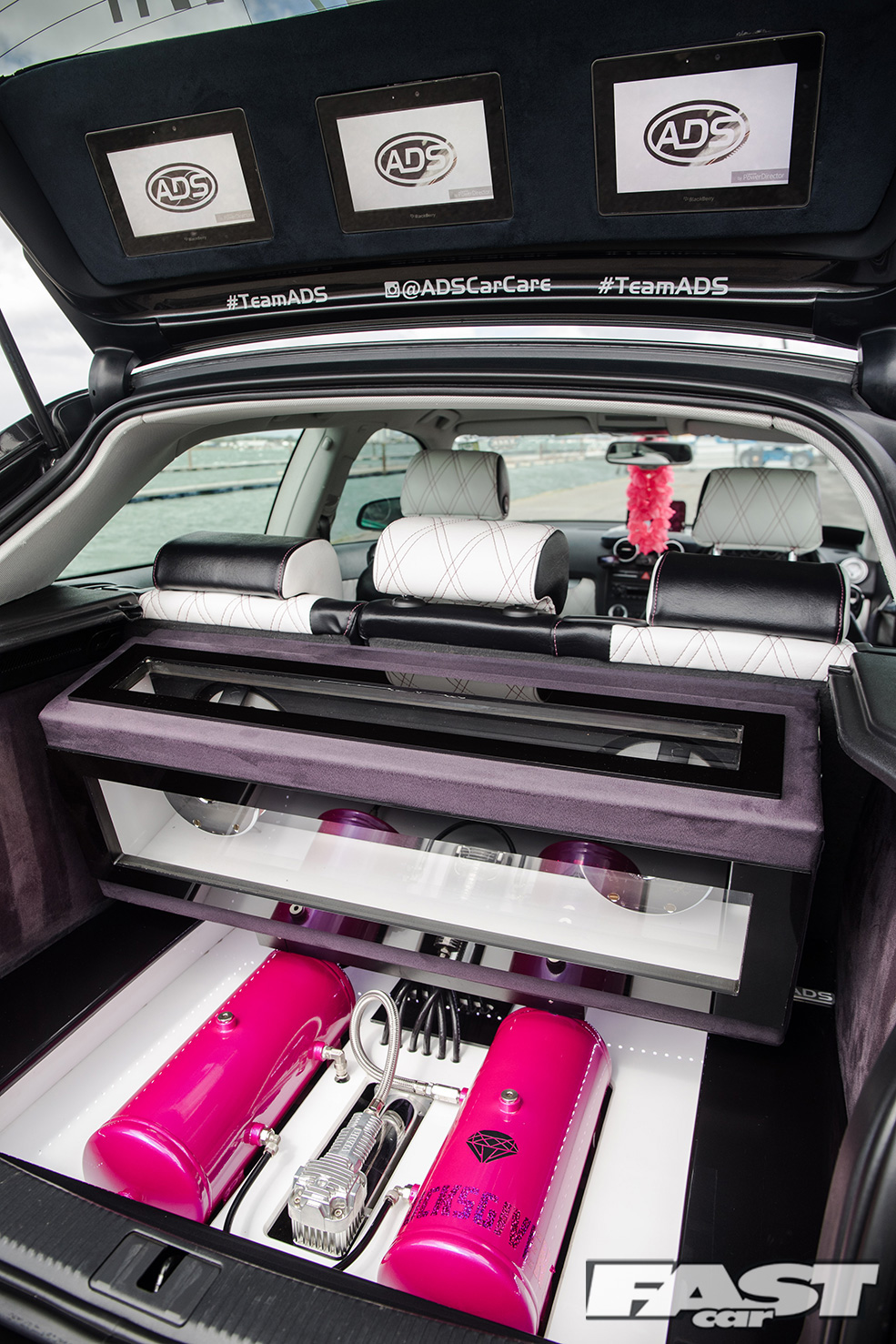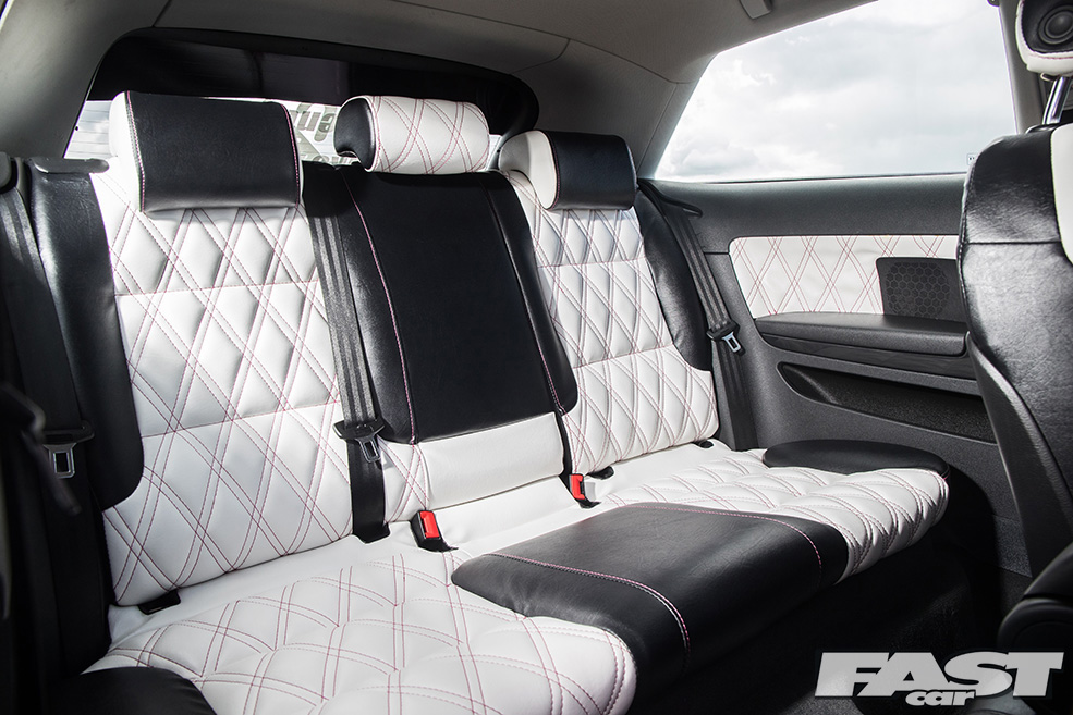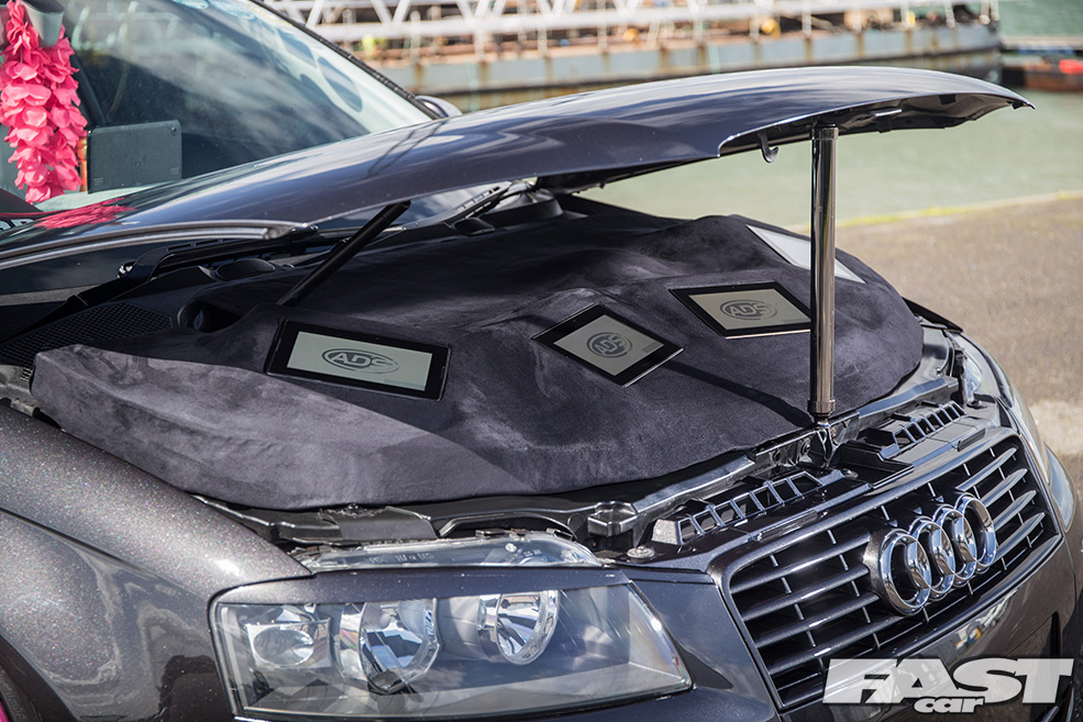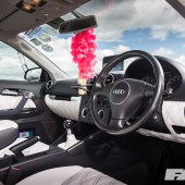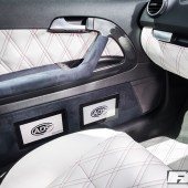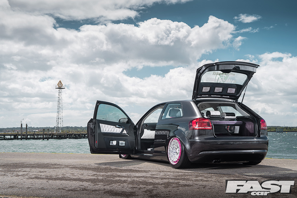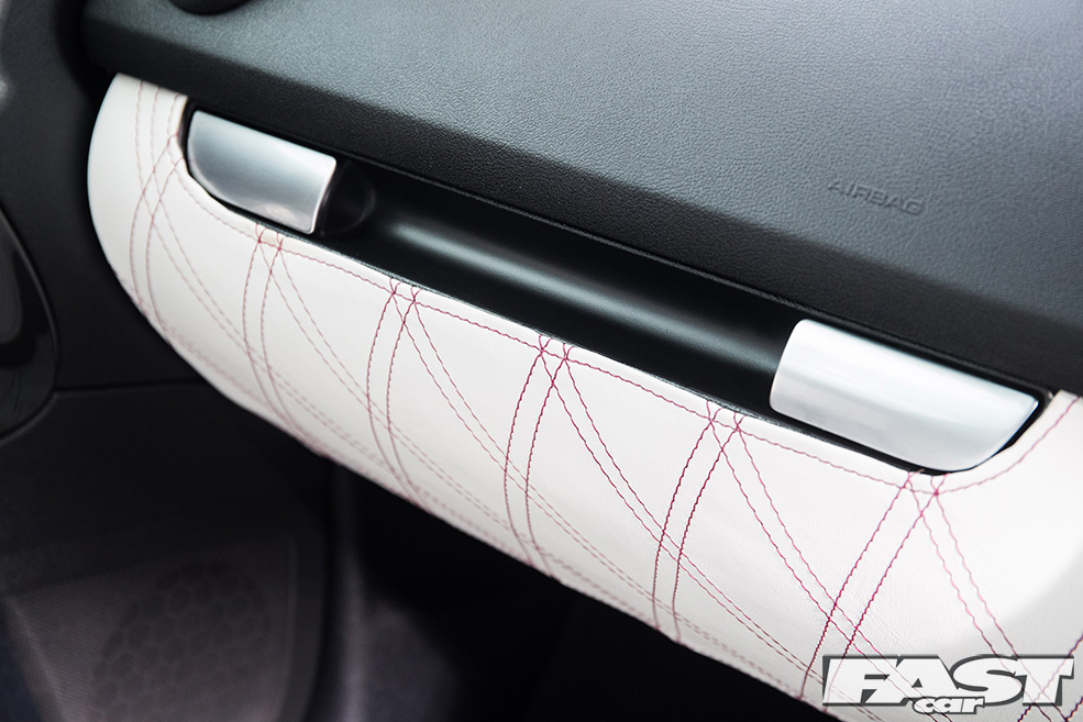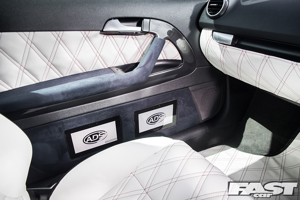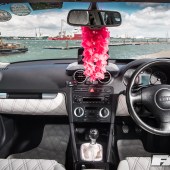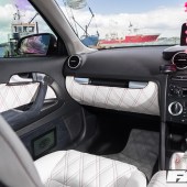 Full re-trimmed Audi Sport interior in white and black leather with pink Bentley stitch; baby changing bag in matching trim; white oil pressure gauge; full Audi light upgrade package; 2x tablets per faux Alcantara door card; custom centre console tablet mount; air suspension boot install (comprising V2 management and 2×2.5-litre air tanks finished in Candy Pink in Pearl Grey surround); 2x Focal Utopia BE 21 WX 8in sub woofers with polished backs; 2x Genesis GT1 Black Edition amplifiers; Bluetooth Play2 unit with original headunit fascia; 3x extra tablets on boot lid interior in faux Alcantara housing.