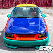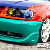 Original Harlequin colours, custom front bumper, Abt splitters, Abt spoilers, Oettinger grill, Hofele Design headlights, Hofele Design rear light covers, JDM tailgate, Dietrich RS2 rear bumper, Hella magic indicators (blue) and rear lights (green), custom door handles, DTM cup mirrors, 6N2 gutter strips, smoothed wings