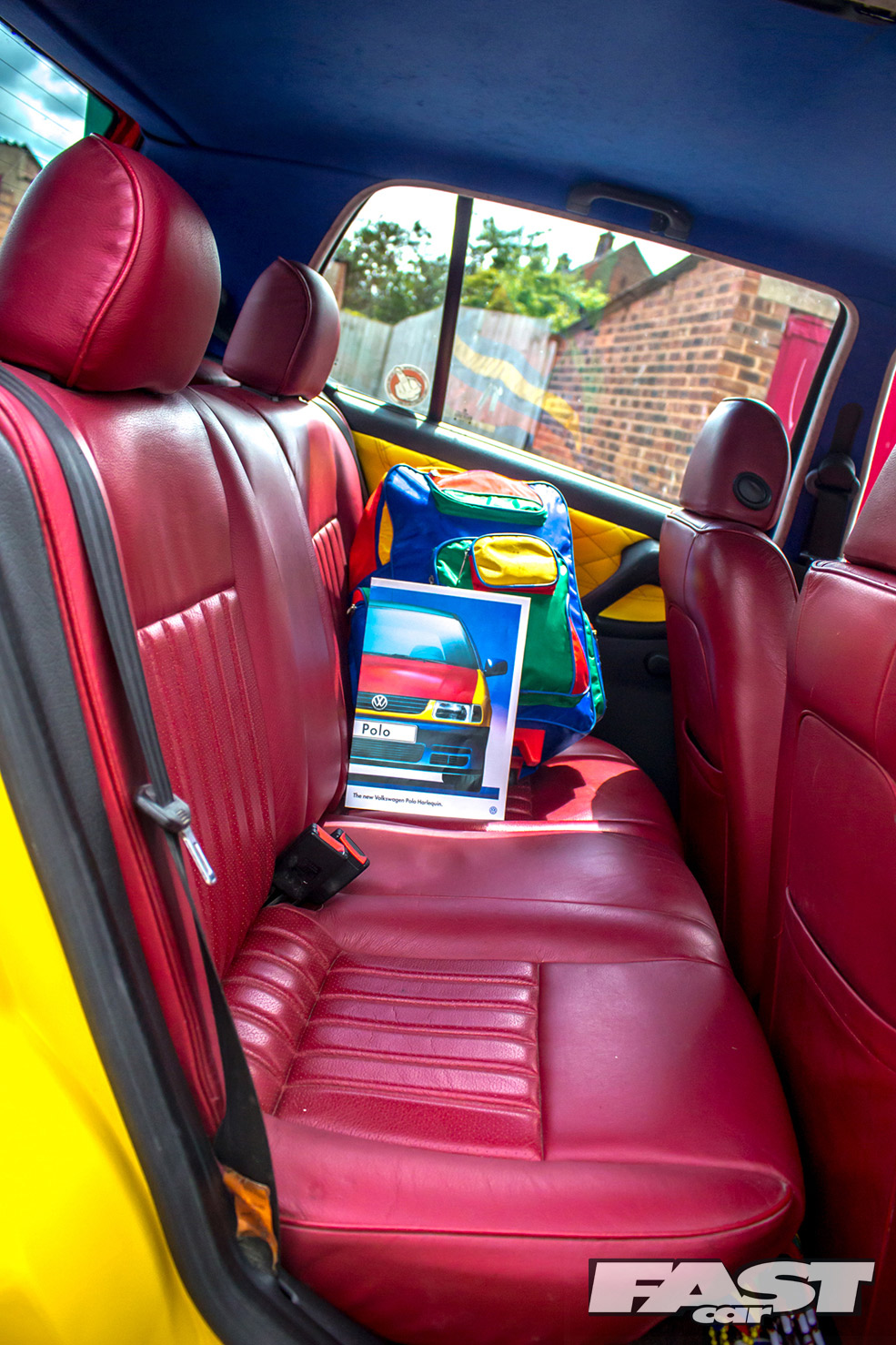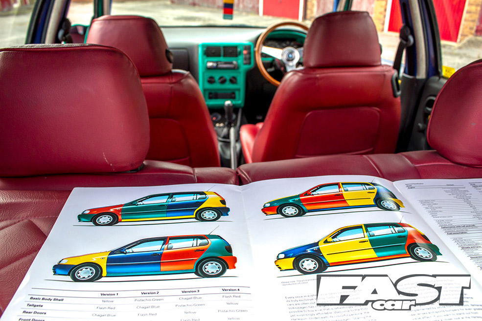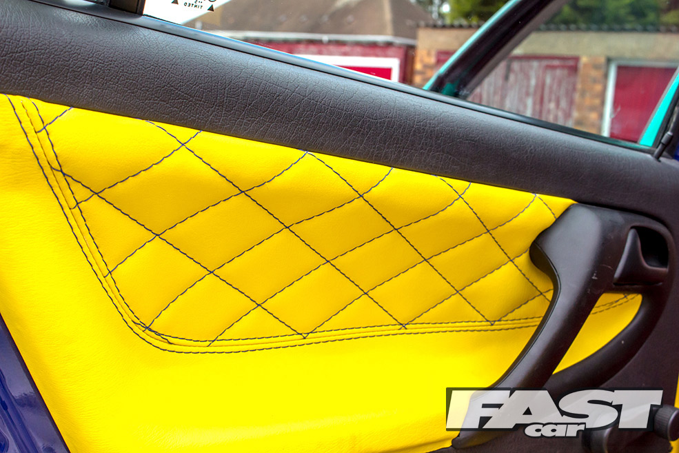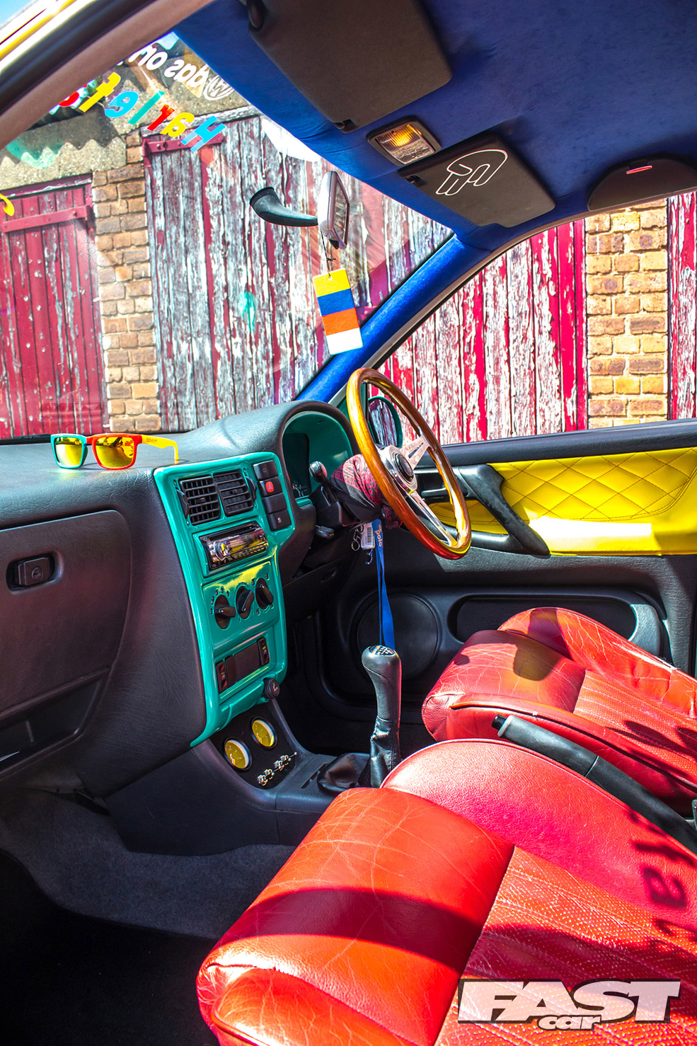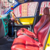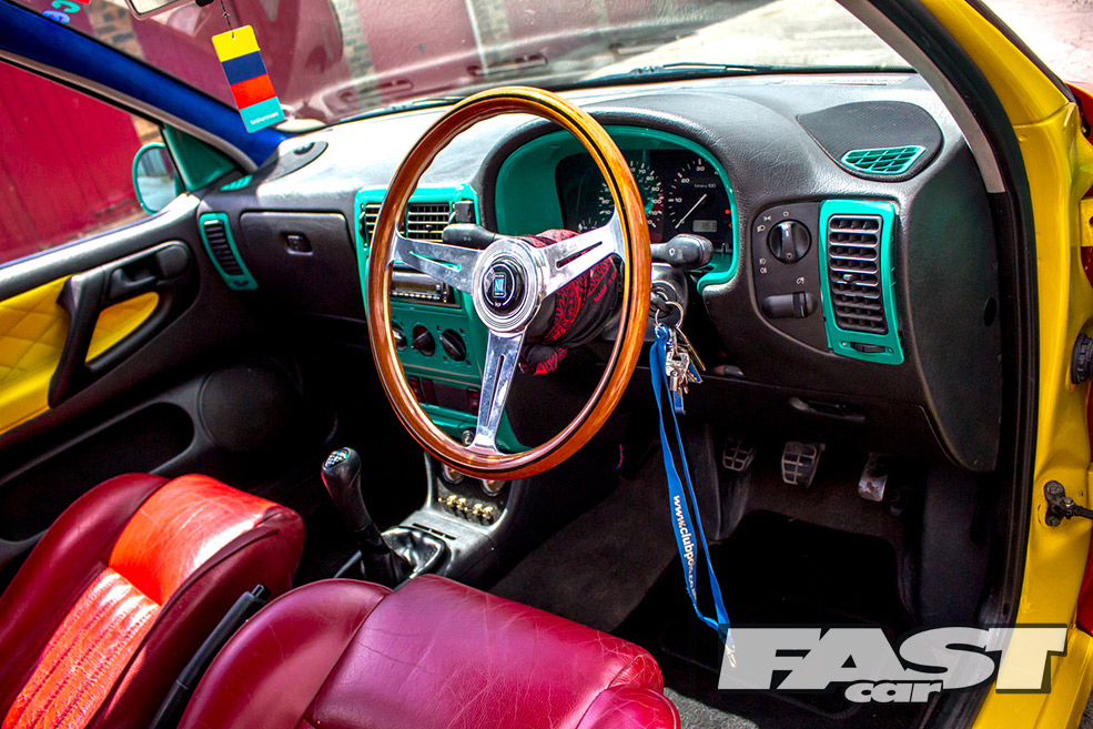 Alfa Romeo 147 red leather seats (front and rear), red leather diamond-stitched parcel shelf and yellow leather diamond-stitched doorcards (colour-coded stitching to match exterior colours), blue suede headlining, pistachio dash trim, Nardi Torino wood steering wheel, Mk3 Golf black sun visors, matte black grab handles