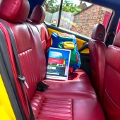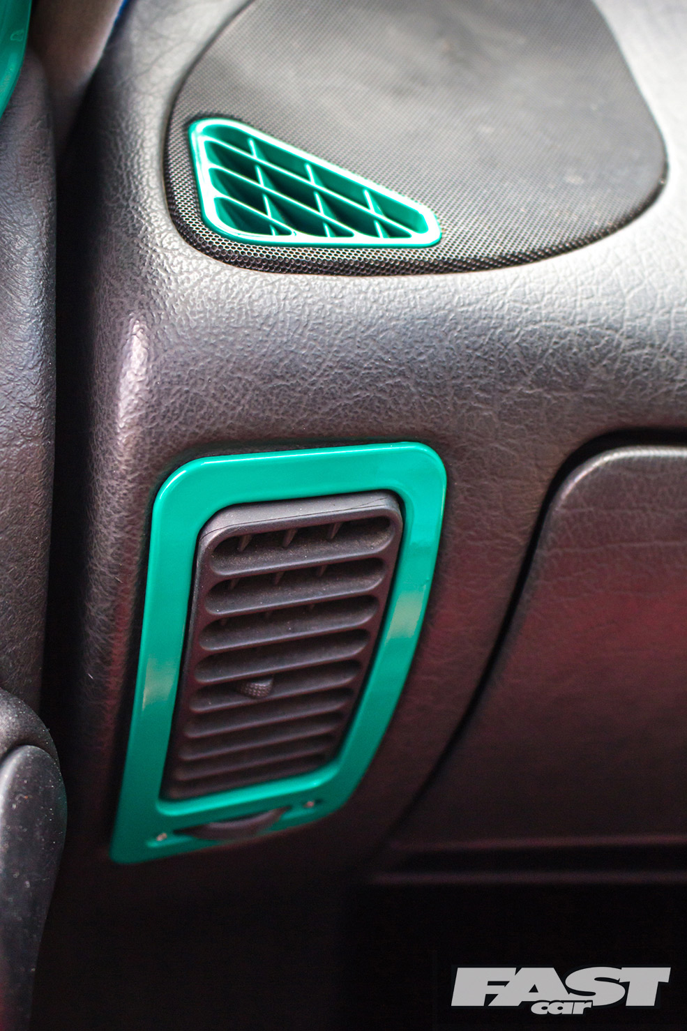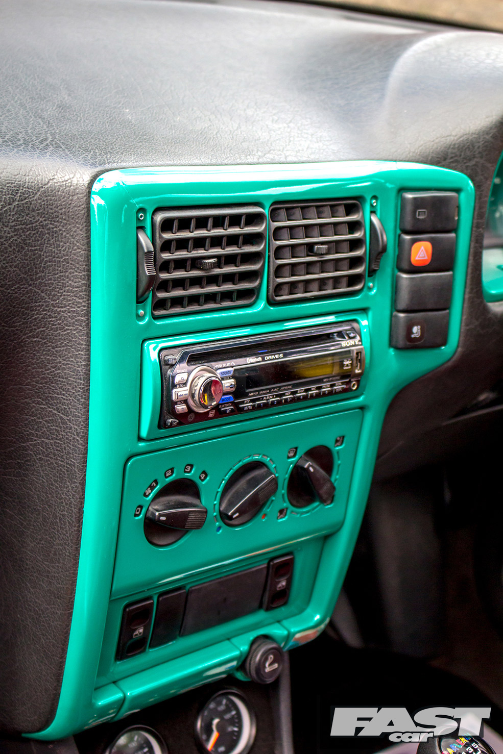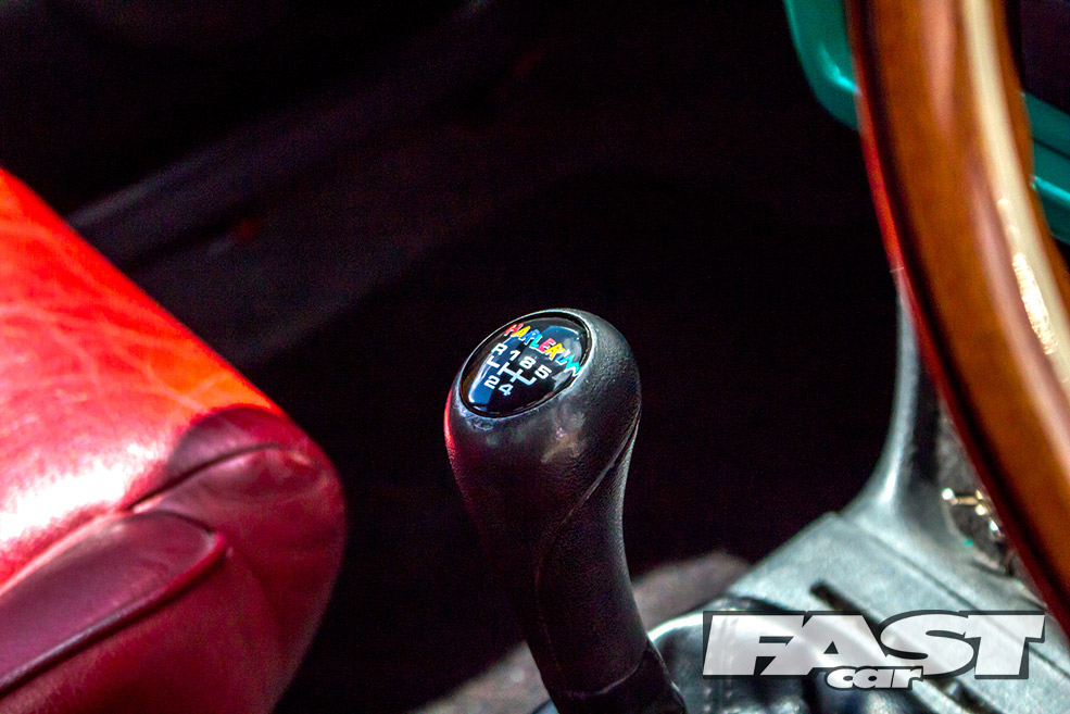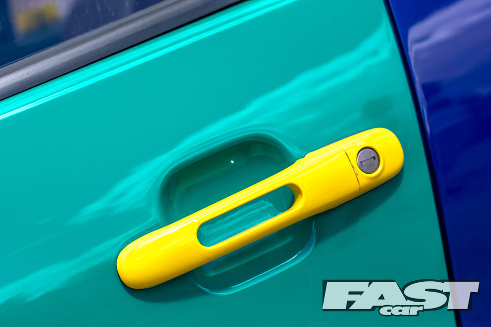 Alfa Romeo 147 red leather seats (front and rear), red leather diamond-stitched parcel shelf and yellow leather diamond-stitched doorcards (colour-coded stitching to match exterior colours), blue suede headlining, pistachio dash trim, Nardi Torino wood steering wheel, Mk3 Golf black sun visors, matte black grab handles