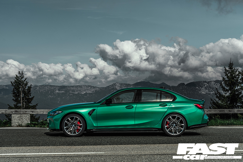 Next up, and continuing at the front, you have those angled air intake vents that point directly towards an oil cooler and of course the brakes/wheels. On the bonnet, there are sculpted vents, or none vents as they aren’t open, just an aerodynamic design feature. Follow your eyesight down the side of the car and you’re met with thumping great wheel arches, some 80mm wider than the standard 3-series. This is reminiscent of the BMW E30 M3 that had flared arhces.
