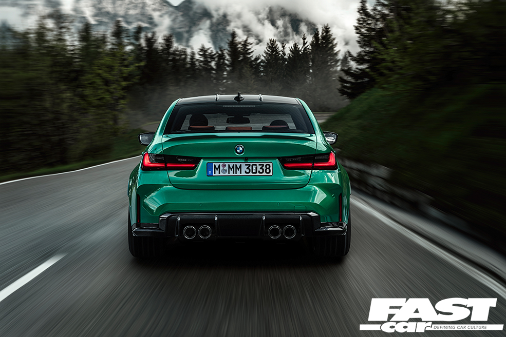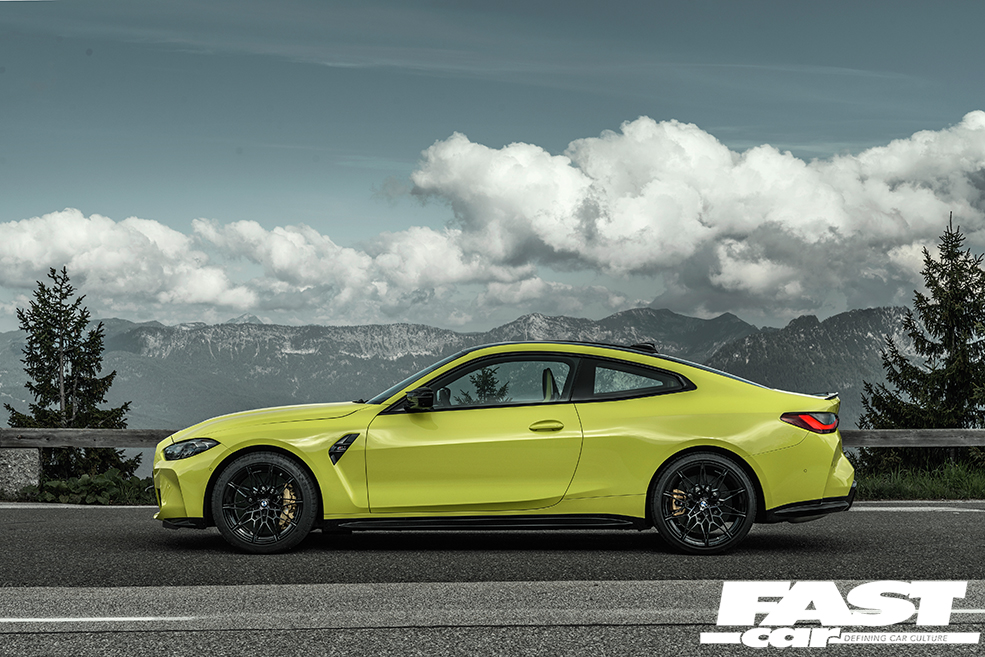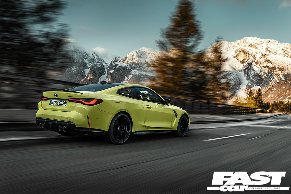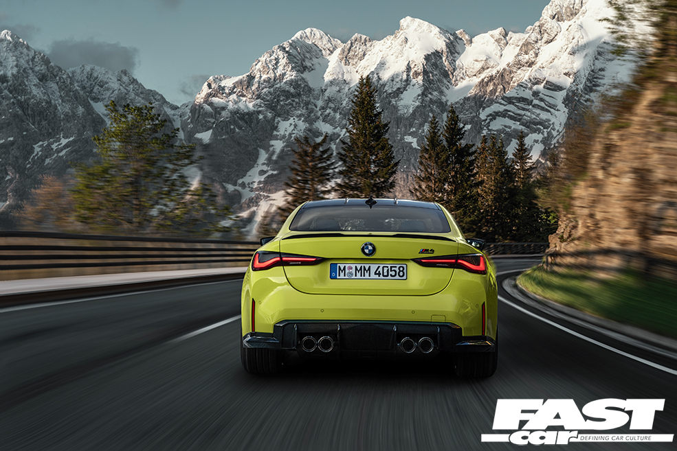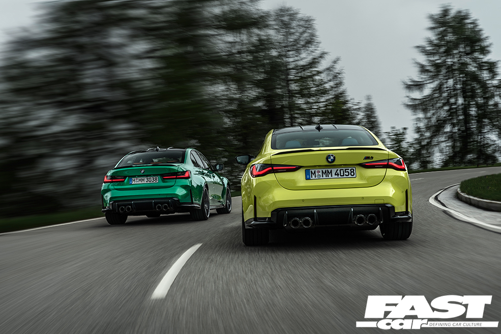 Right, let’s get to it. Under the bonnet is the new S58 engine, 3.0-litres in displacement, in-line six cylinder motor with twin-turbos (each of which works three cylinders). The cars you see here are competition spec and get 503bhp and 479lb ft, mated to an eight-speed autobox, making 0-62mph sprint times of 3.9 seconds. Remember, this is rear-wheel drive, so traction is still an issue. In the future you’ll see the M four-wheel drive system added which will drop that figure significantly. It’ll also mean that you can shift some of the power rearwards at the tap of a button, and that same button, if pressed twice, will allow for full rear-wheel drive to create new clouds.
