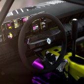 Behind the steering wheel, which is suitably futuristic looking, you’ll find a set of digital displays in place of the original R5 Turbo’s analogue dials. These aren’t any regular digital instruments though either. Lit up in pink and yellow, they take on an appearance inspired by retro videogames. Oh, and there appears to be a Renault-branded teddy bear stored away in the passenger side. We’re informed that its name is ‘Drifty’, and although we’re not 100% sure what it’s doing there, it’s cute so we’ll let it slide.