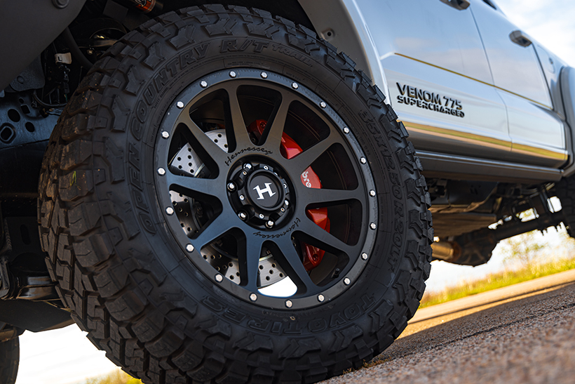 To handle any terrain with ease, the Venom 775 boasts a 6-inch lift. That’s more than enough ground clearance for some off-road adventures. The 20in 10-spoke alloy wheels, shod with rugged 35in off-road tires, contribute to both the truck’s off-road abilities and aggressive appearance. Upgraded Fox suspension ensures a smooth and controlled ride, while massive Brembo brakes with eye-catching red calipers offer significant stopping power.