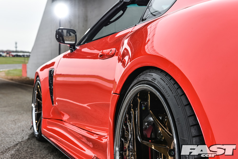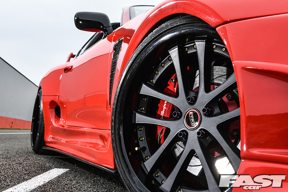 HSD adjustable coilovers; Carbing front strut brace with brake stopper; Titan front and rear adjustable anti-roll bars; refurbished subframes and arms with complete Superpro bush replacement; new Toyota diff bushes; KSport 8-pot (front) and 4-pot (rear) brake calipers with 356mm discs; stainless steel braided brake lines; ATE Racing Blue brake and clutch fluid; 10.5×19-inch (front) and 13×19-inch (rear) custom Avant Garde 3-piece split rims; 10.5×19-inch (front) and 13×19-inch (rear) Weds Kranze LXZ 3-piece split rims; polarised wheel bolts; 275/30/19 Goodyear F1 asymmetric tyres (front); 315/25/19 Pirelli P-Zero Rosso tyres (rear).