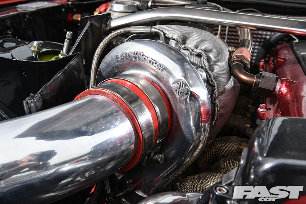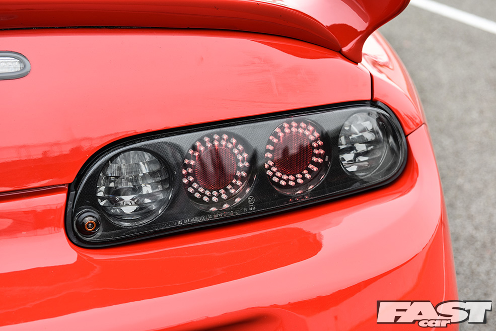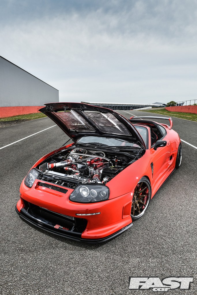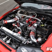 Fully built 3.0-litre 2JZ-GTE VVTi turbocharged, straight-six engine; ARP head studs, rod bolts and main bolts; Clevite bearings; forged Wiseco pistons; forged eagle con rods; 1.2mm HKS head gasket; chrome plated alternator; Titan crank damper pulley; Unorthodox Racing pulleys; HKS 246-degree race camshafts; Titan camshaft pulleys; Hypertune inlet manifold; Corvette LS7 90mm drive-by-wire throttle body; BorgWarner S300 91-97 turbocharger; Turbosmart 50mm wastegate; TiAL blow-off valve; custom 4-inch turbo downpipe with flexi-joint; custom 4-inch exhaust system; Blitz air filter; TRD thermostat; custom water neck; custom polished top radiator pipe; Speedwells powdercoated cam covers; custom brake fluid cap; custom power steering cap; Blitz oil cap; -12AN catch can setup in driver’s side wing; -10AN remote oil filter in passenger’s side wing; custom braided oil/return lines; torque damper on custom bracket; 5-inch ETS front-mount intercooler with 4-inch inlet/outlet and custom pipework; 25-row HKS oil cooler with custom bumper ducting and -10AN lines; AAP dual electric fans with polished fan shroud; AAP aluminium radiator; Syvecs S16 management; AEM wide-band with gauge; AEM boost control solenoid; Bosch 3-bar map sensor; Boostlogic billet 3-pump fuel hanger with twin Walbro GSS 341 pumps; Aeromotive fuel pressure regulator; Aeromotive 100-micron race fuel filter; Injector Dynamics 1000cc fuel injectors; Hypertune fuel rail in custom anodised red.