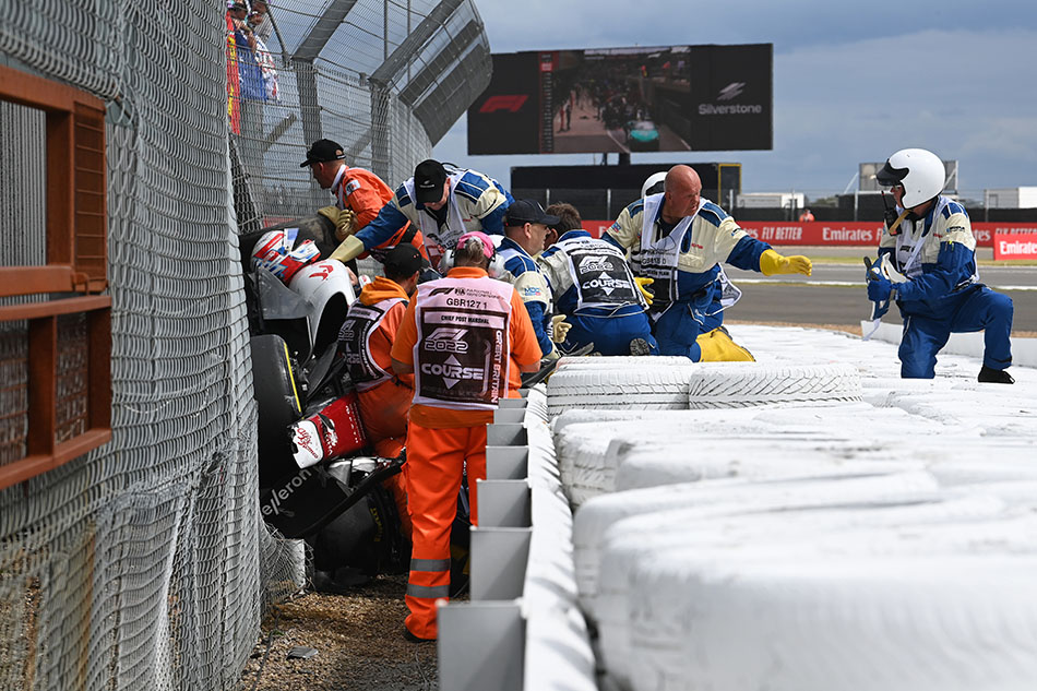 SILVERSTONE CIRCUIT, UNITED KINGDOM – JULY 03: Marshals and medics assist Zhou Guanyu, Alfa Romeo C42 during the British GP at Silverstone Circuit on Sunday July 03, 2022 in Northamptonshire, United Kingdom. (Photo by Mark Sutton / Sutton Images)